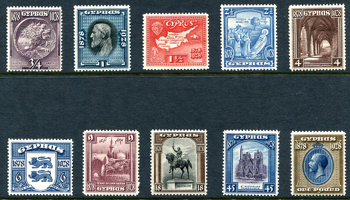 Complete mint Hinged set of the 1928 pictorial series of 10 different designs / values. Including scenes of "Hospice of Umm Haram at Larnaca" and "Statue of Richard Coeur de Lion, London", this series is one of the most popular of GeoV period. A tough set to find this nice. 2024 Scott US$412.00 =