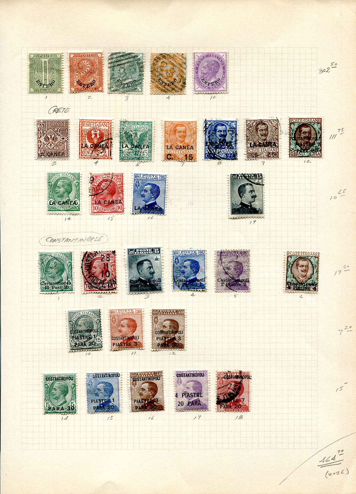 An old-time album page, with a combination of mint and used Italian Offices including General issues ("Estero"), Offices in Crete and Offices in Constantinople. The value adds up quickly here! 2025 Scott US$464.70 =