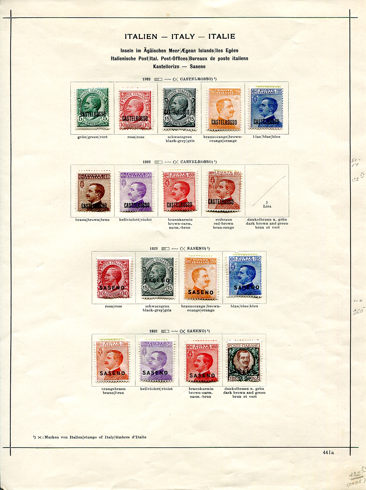 An old album page, featuring a mint Hinged offering of Castellorizo #51-59 (catalogue US$172.50) and Saseno #1-8 (catalogue US$260.00). Seldom seen Italian colony / possession issues. 2026 Scott US$432.50 =
