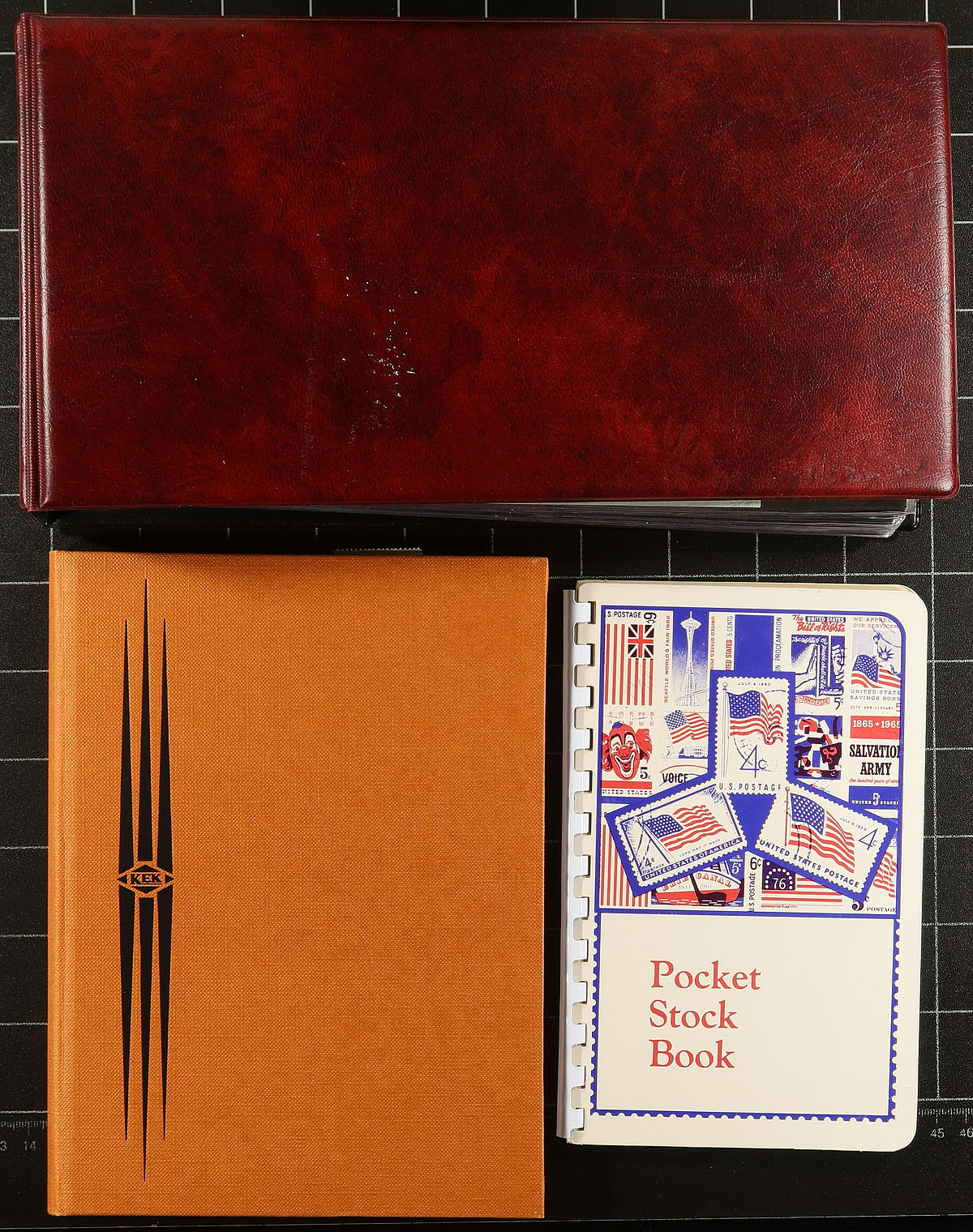Group of useful supplies, including 6 stockbooks (various configurations), 6 cover albums (including a few for longer sized envelopes), and an album with quadrille pages specified for roughly 35 different countries. Items range from used to like new condition, just waiting to be put back into circulation. Estimate =