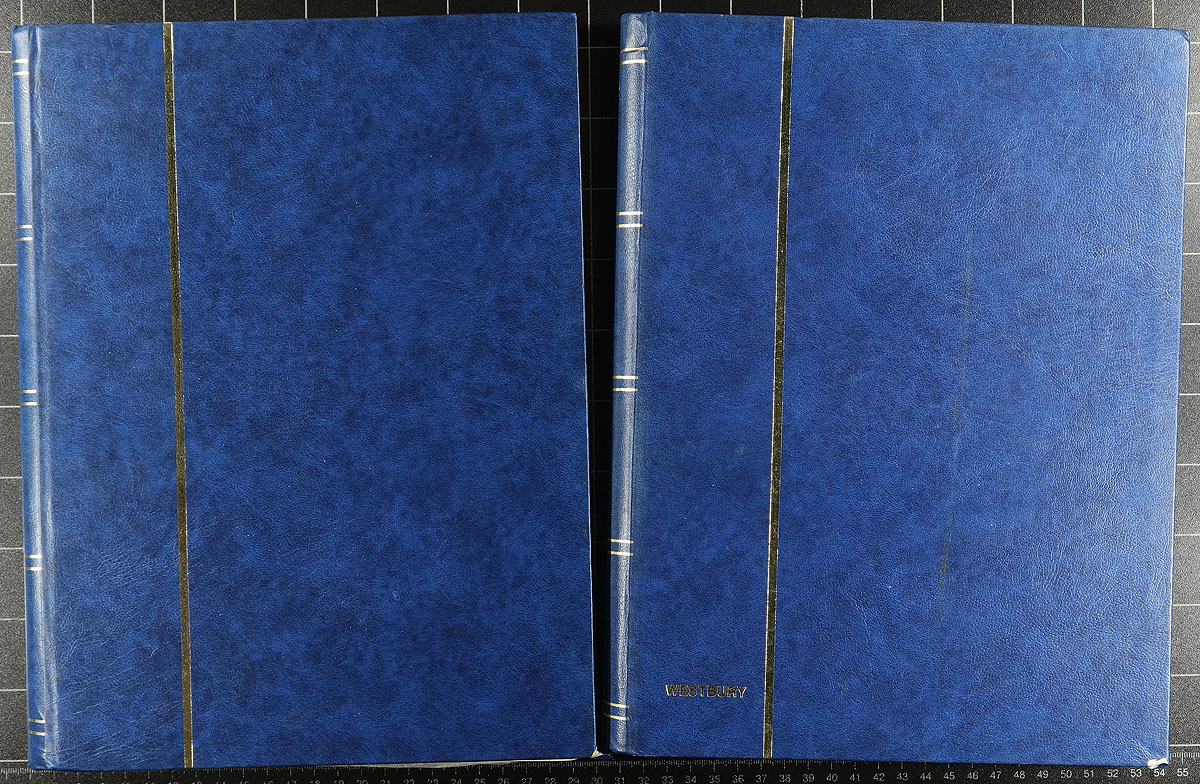 Group of useful supplies, including 6 stockbooks (various configurations), 6 cover albums (including a few for longer sized envelopes), and an album with quadrille pages specified for roughly 35 different countries. Items range from used to like new condition, just waiting to be put back into circulation. Estimate =