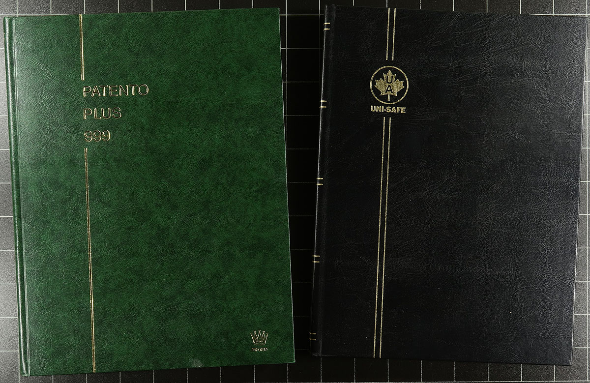 Group of useful supplies, including 6 stockbooks (various configurations), 6 cover albums (including a few for longer sized envelopes), and an album with quadrille pages specified for roughly 35 different countries. Items range from used to like new condition, just waiting to be put back into circulation. Estimate =