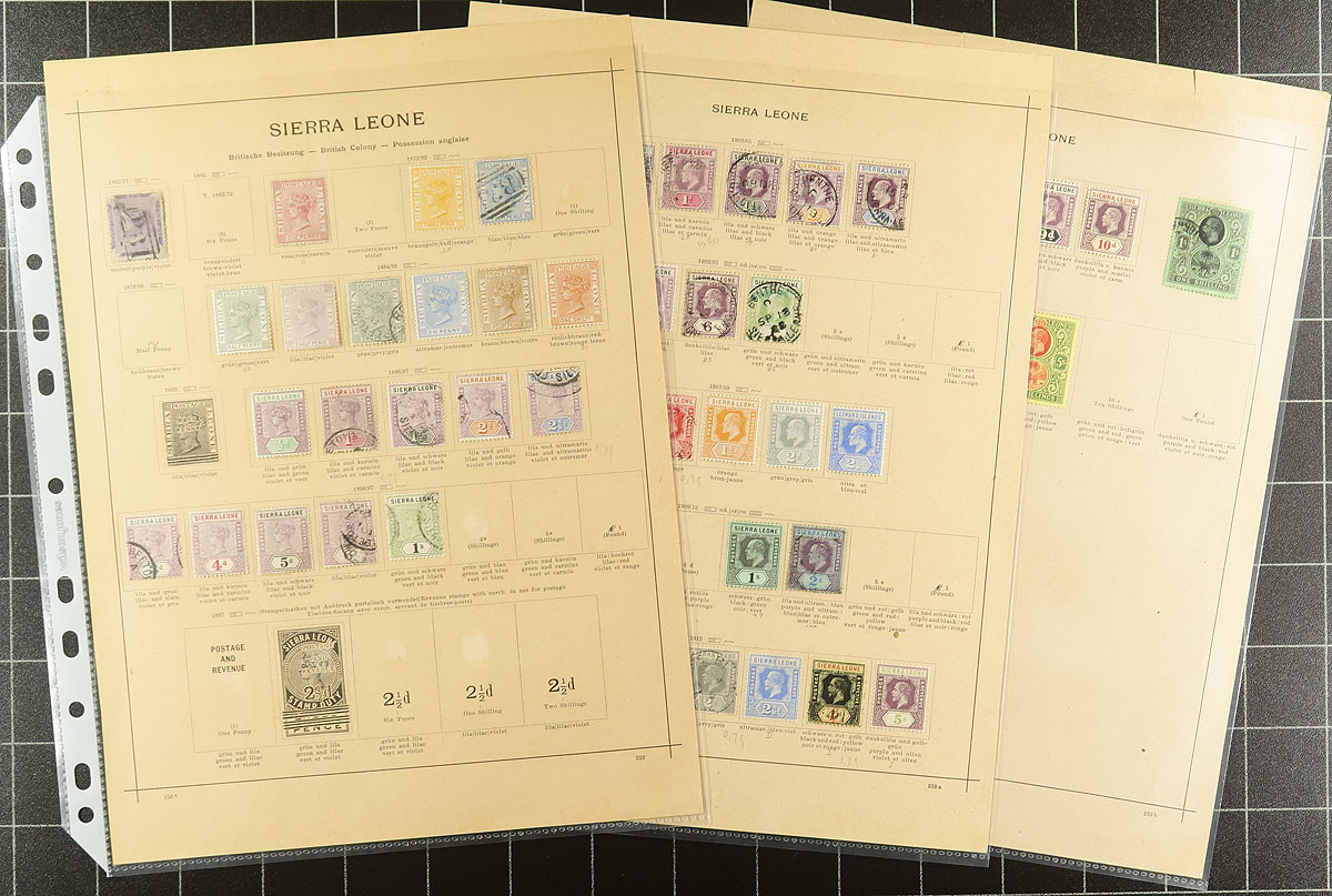 Nice collection of mint and used Sierra Leone on 3 album pages, containing 56 different stamps, ranging from Scott #1/117, noting #s 6 (mh, $85), 9 (used, $45), 116-117 (mh, $60 total). A nice little lot for the Commonwealth collector. All pages shown online. 2025 Scott US$561.00 =