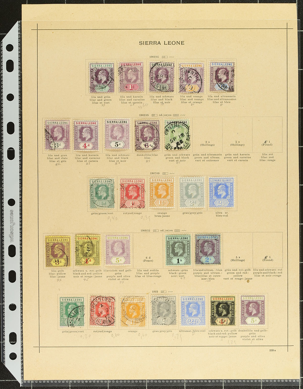 Nice collection of mint and used Sierra Leone on 3 album pages, containing 56 different stamps, ranging from Scott #1/117, noting #s 6 (mh, $85), 9 (used, $45), 116-117 (mh, $60 total). A nice little lot for the Commonwealth collector. All pages shown online. 2025 Scott US$561.00 =
