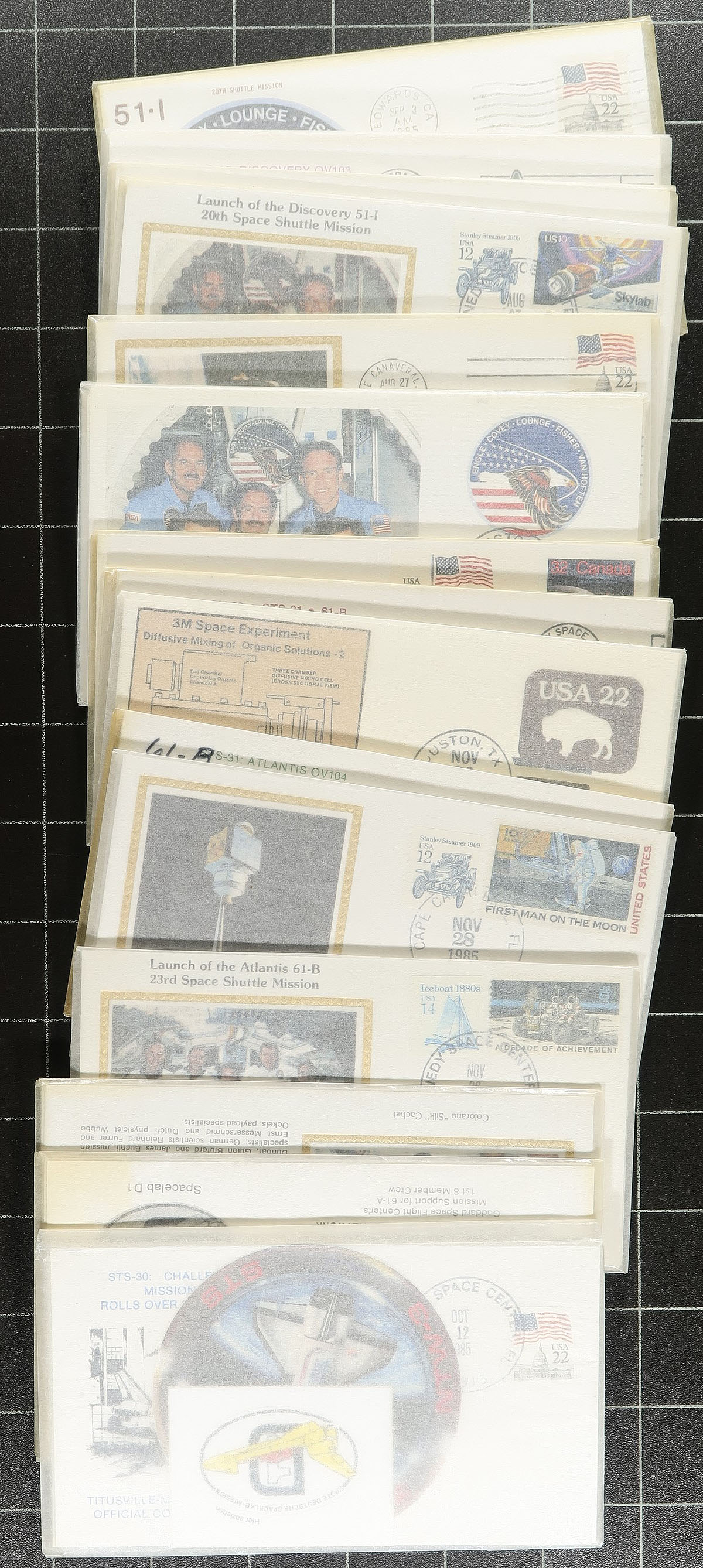 Space Topical Collection. The balance of USA Space topical collection, containing space covers and material from the United States, generally ranging from the 1970's to the 1980's. We note a whole host of items including about a hundred commemorative covers for various space shuttle missions (noting Challenger, Atlantis missions, and more), first day covers, photographs from various missions, space center postmarks, an interesting group of adhesive labels from various missions, literature, and more. A very interesting lot ideal for astrophilatelists, and topical collectors. Estimate =