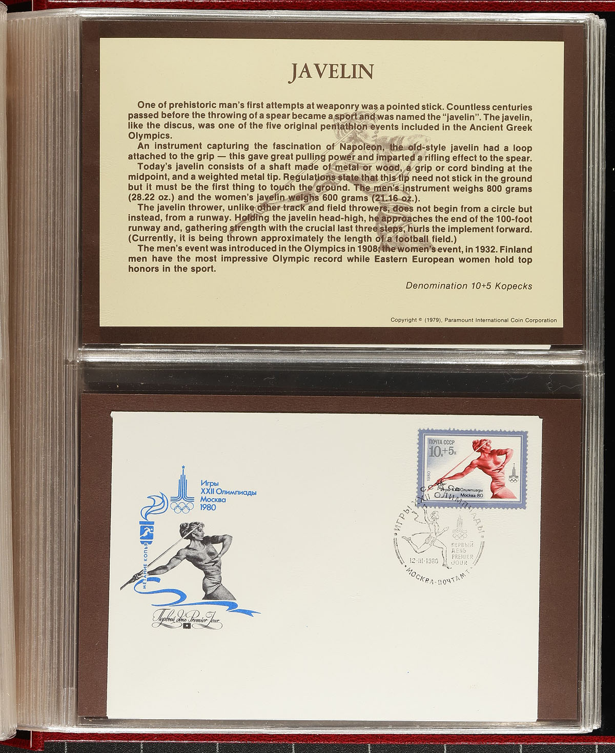 Group of 7 stamp company prepared topical collections in nicely bound albums containing a few hundred covers and stamps including: 1980 Olympic Collection (with slipcase), Limited Edition First Day Lithographs, First Day Covers From Around The World, Grimms' Fairytales Panel Collection, Postal Commemorative Society World of Stamps, Royal Wedding Philatelic Panels Collection, The Prince Andrew Royal Wedding First Day Covers. A very nice group primarily focusing on a few hundred Commonwealth covers and stamps. A very nice group. Estimate =