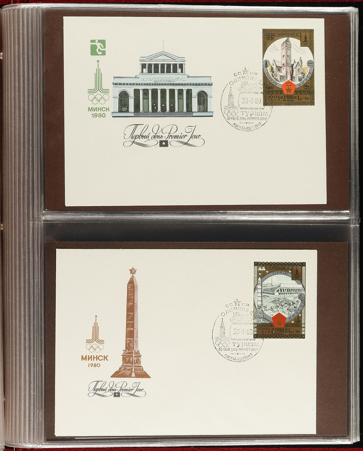 Group of 7 stamp company prepared topical collections in nicely bound albums containing a few hundred covers and stamps including: 1980 Olympic Collection (with slipcase), Limited Edition First Day Lithographs, First Day Covers From Around The World, Grimms' Fairytales Panel Collection, Postal Commemorative Society World of Stamps, Royal Wedding Philatelic Panels Collection, The Prince Andrew Royal Wedding First Day Covers. A very nice group primarily focusing on a few hundred Commonwealth covers and stamps. A very nice group. Estimate =