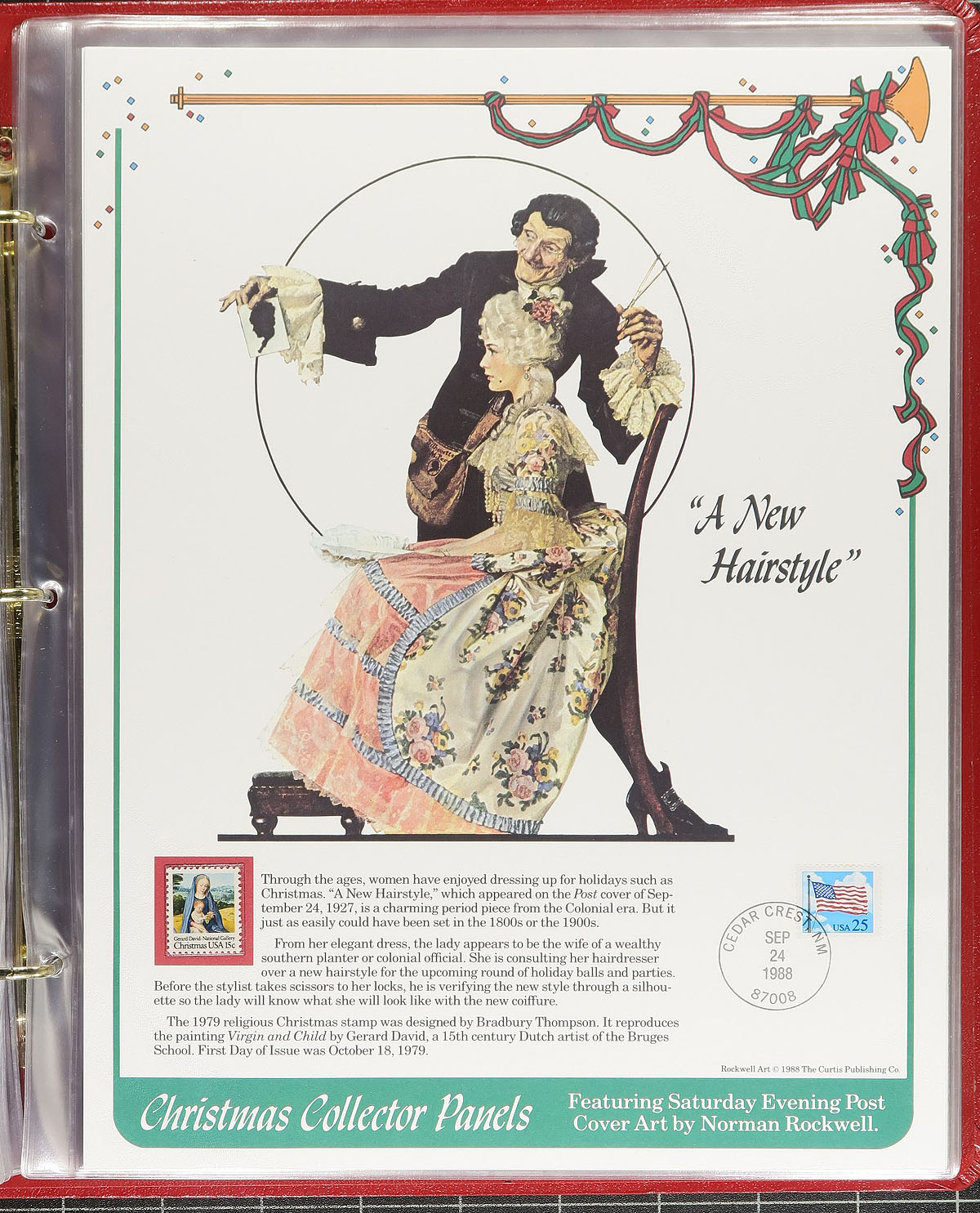 Group of 10 stamp company prepared topical collections in nicely bound albums containing a few hundred covers and stamps including: The International Council for Bird Preservation, Historic Landmarks of Europe First Day Cover Collection, History of Communications in Europe First Day Cover Collections, The History of Aviation, Christmas Collector Panels "Featuring Norman Rockwell", U.S. Commemorative Stamp Collector Panels, along with 4 more. A nice lot for thematic and topical collectors. Estimate =