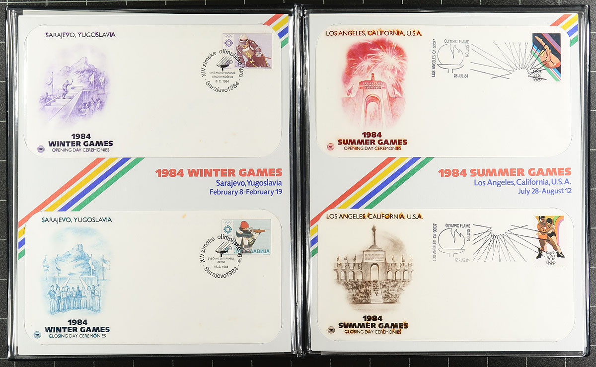 Group of 8 U.S.A. topical collections, prepared and sold intact as collections, in nicely bound albums containing a few hundred covers and stamps including: Historic Stamps of America, 1984 Olympics Commemorative Folio, Flags of the Fifty States, State Birds and Flowers Commemorative Mint-Stamp Panels, U.S. Commemorative Stamp Collector Panels, and more. A nice lot for thematic and topical collectors. Estimate =