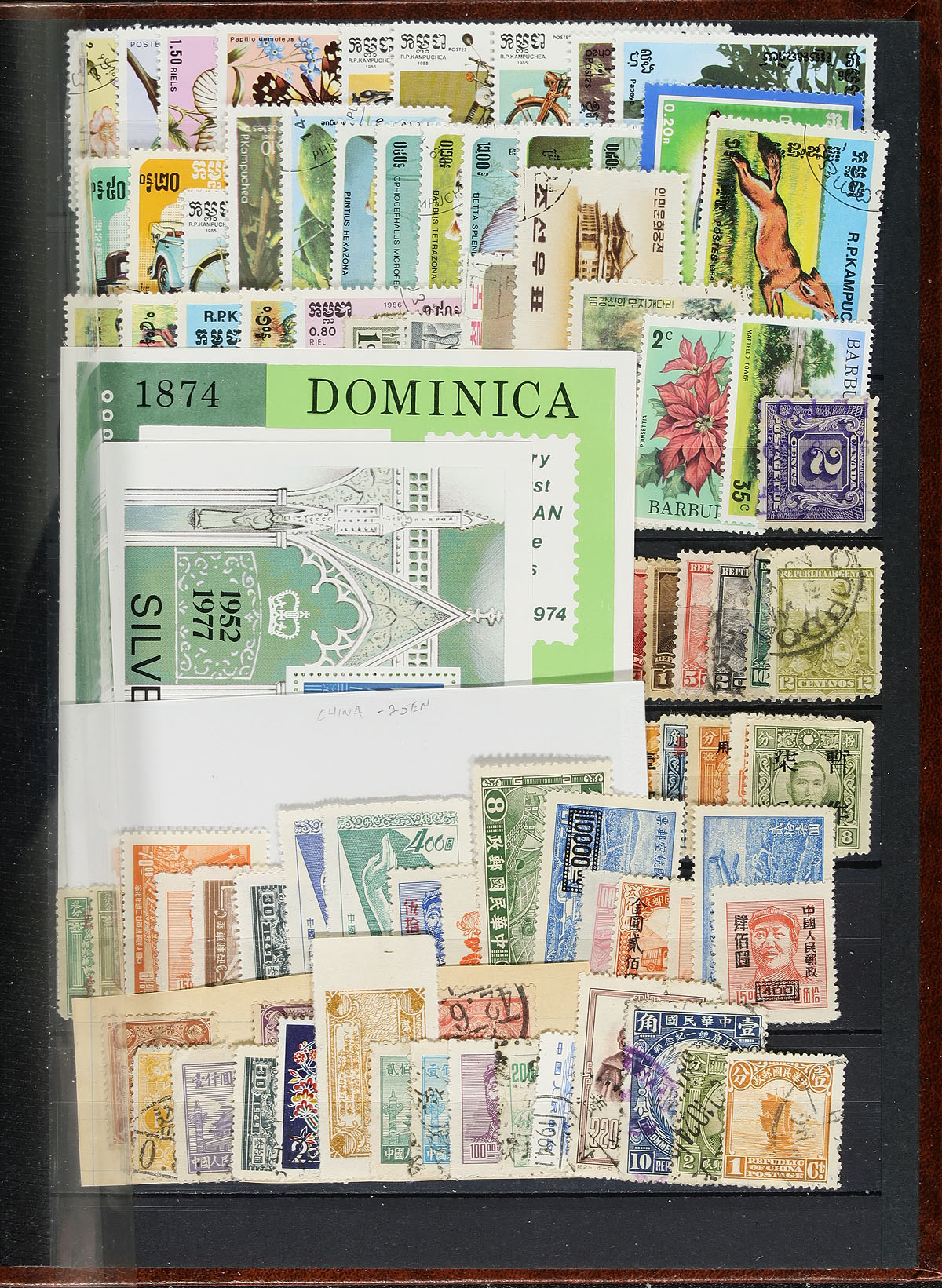Large collections / accumulations of primarily used worldwide stamps in 4 stockbooks and 2 albums. The lot contains a few thousand stamps, loosely organized in the stockbooks, and better organized in the 2 albums (A to Z countries), with material generally ranging from 1900 to the 1970's. We note better representation from European countries including Austria, Germany, Switzerland, along with Asia and British Commonwealth areas. A nice lot with potential finds for worldwide, thematic, and topical collectors. Online photos show a sampling. Estimate =