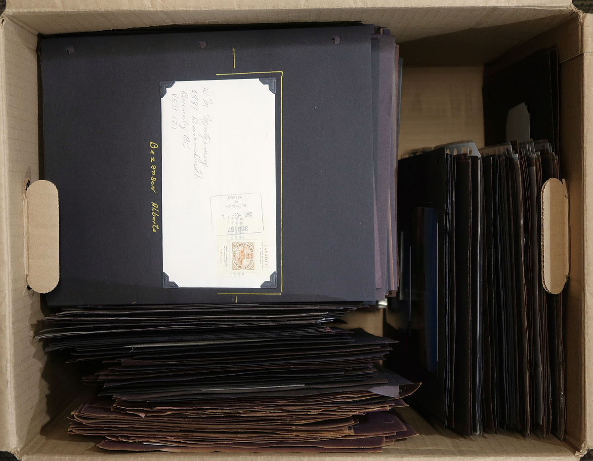 Alberta Postal History. A modern collection of Alberta postmarks, with many different post offices represented by at least one cover, on many hundreds of homemade pages in a carton. The majority of covers range from the 1980's to the early 2000's, with the majority of postmarks being POCON types (we did note a few other postmark types), including many from Edmonton (noting various post office locations) and several smaller towns. The lot also includes several personal pictures, noting signposts, grain elevators, post offices, and a few postmaster letters, giving this lot a visual/social touch. Just a few of the offices include Pickardville, Valleyview, Crooked Creek, Debolt, Bezamson, Wemby, etc. A nice lot for the Alberta or Canada post mark collector. Estimate =