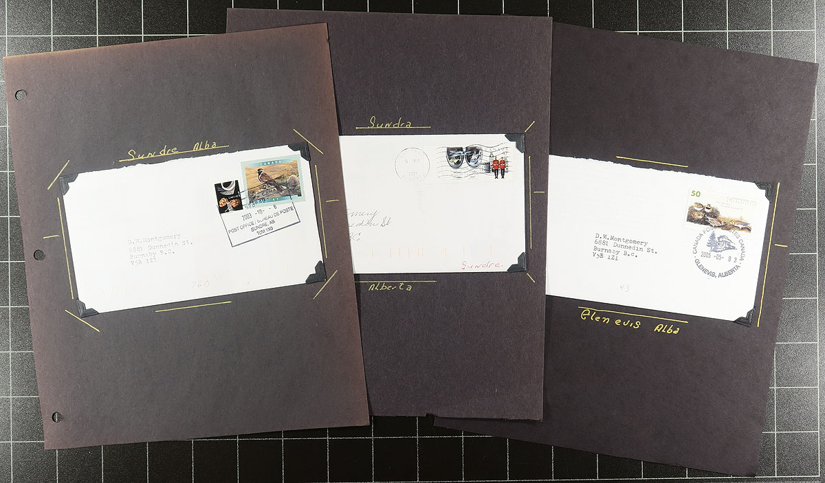 Alberta Postal History. A modern collection of Alberta postmarks, with many different post offices represented by at least one cover, on many hundreds of homemade pages in a carton. The majority of covers range from the 1980's to the early 2000's, with the majority of postmarks being POCON types (we did note a few other postmark types), including many from Edmonton (noting various post office locations) and several smaller towns. The lot also includes several personal pictures, noting signposts, grain elevators, post offices, and a few postmaster letters, giving this lot a visual/social touch. Just a few of the offices include Pickardville, Valleyview, Crooked Creek, Debolt, Bezamson, Wemby, etc. A nice lot for the Alberta or Canada post mark collector. Estimate =