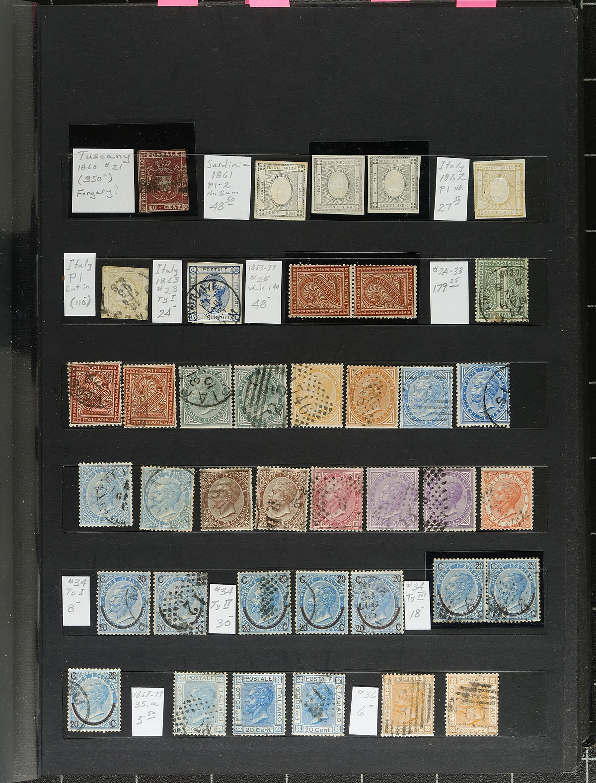 Collection of mint and used Italy, 1863-2009, containing a few hundred stamps ranging from Scott #25/1428, housed in a 32 page stockbook. This neatly organized collection contains primarily used stamps, with a mix of mint material primarily from the 1930s onwards, and includes a few States, semi-postals, airmails, and other baack of the book issues. The collection also includes owner's notations and current catalogue values noting many stamps, sets, and partial sets in the $20 and up range including #s 24-33 (used, c.v. $179 total), 37-44 (used, $114 total), Sardinia 10-15 (mh, $222 total), just to name a few. The stamps only take up half of the stockbook, so plenty of room for expansion. A few small faults noted with a few of the stamps, overall fine to very fine. 2026 Scott US$2320.00 =