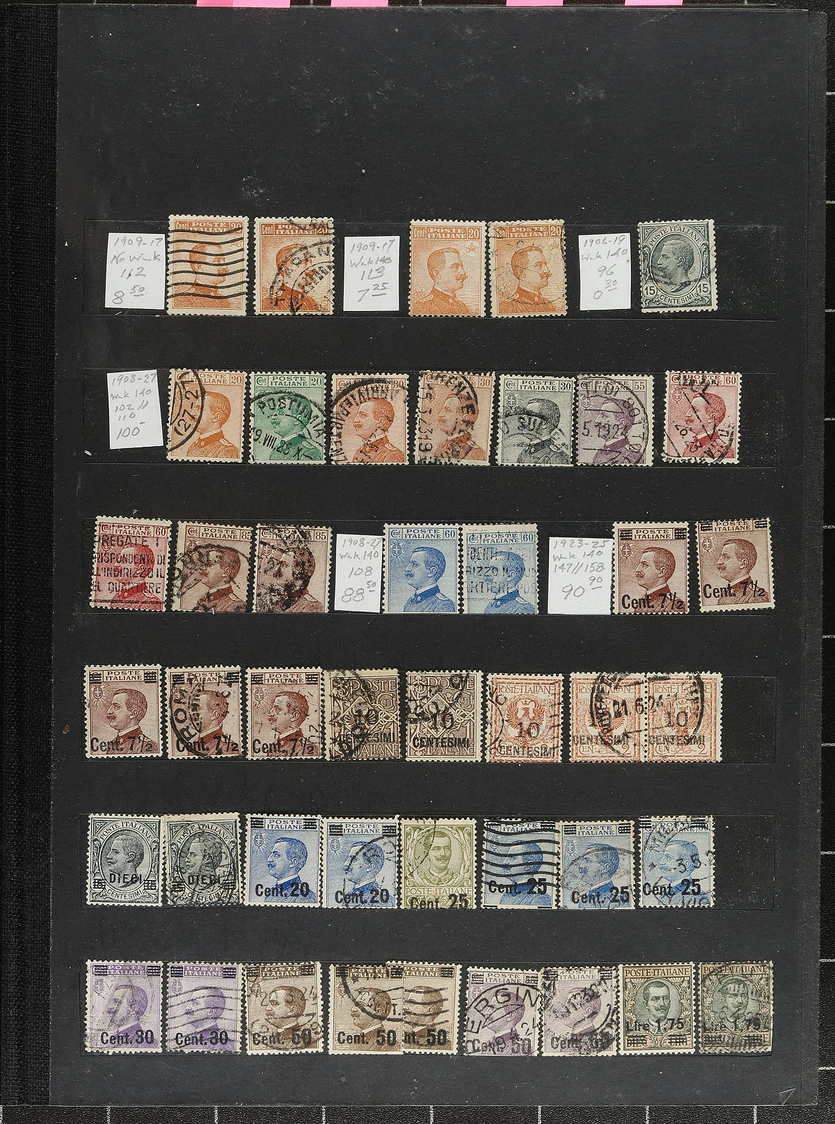 Collection of mint and used Italy, 1863-2009, containing a few hundred stamps ranging from Scott #25/1428, housed in a 32 page stockbook. This neatly organized collection contains primarily used stamps, with a mix of mint material primarily from the 1930s onwards, and includes a few States, semi-postals, airmails, and other baack of the book issues. The collection also includes owner's notations and current catalogue values noting many stamps, sets, and partial sets in the $20 and up range including #s 24-33 (used, c.v. $179 total), 37-44 (used, $114 total), Sardinia 10-15 (mh, $222 total), just to name a few. The stamps only take up half of the stockbook, so plenty of room for expansion. A few small faults noted with a few of the stamps, overall fine to very fine. 2026 Scott US$2320.00 =