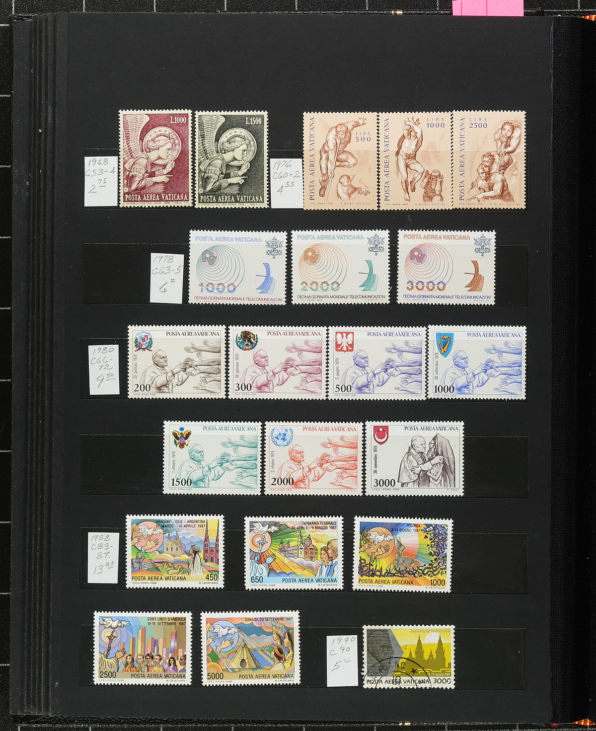 Collection of mint and used Italy, 1863-2009, containing a few hundred stamps ranging from Scott #25/1428, housed in a 32 page stockbook. This neatly organized collection contains primarily used stamps, with a mix of mint material primarily from the 1930s onwards, and includes a few States, semi-postals, airmails, and other baack of the book issues. The collection also includes owner's notations and current catalogue values noting many stamps, sets, and partial sets in the $20 and up range including #s 24-33 (used, c.v. $179 total), 37-44 (used, $114 total), Sardinia 10-15 (mh, $222 total), just to name a few. The stamps only take up half of the stockbook, so plenty of room for expansion. A few small faults noted with a few of the stamps, overall fine to very fine. 2026 Scott US$2320.00 =