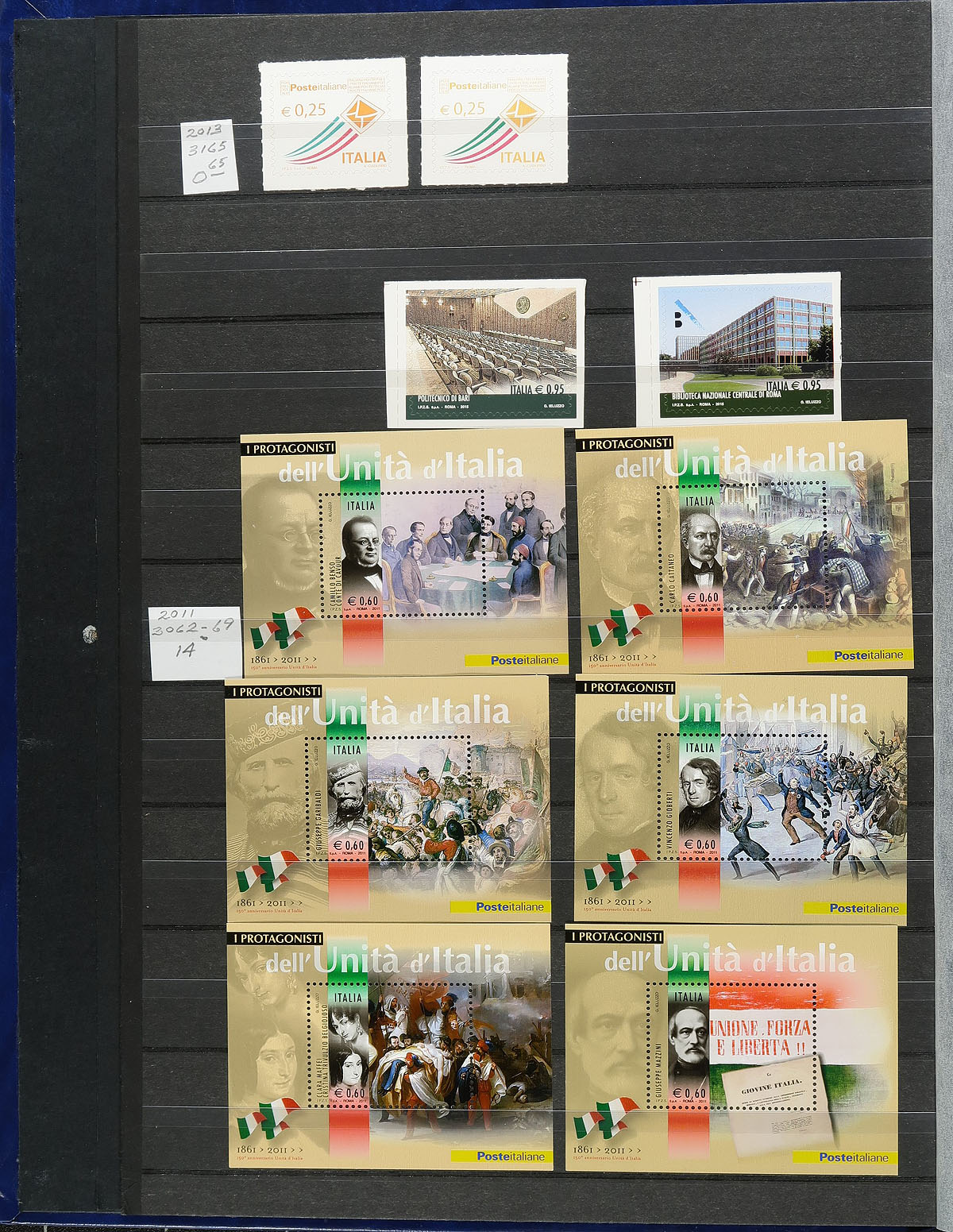 Interesting collection of mint and used Italy, 1945-2013, containing over 800 stamps housed in 2 stockbooks. The bulk of the lot comes from the first stockbook containing mostly back of the book material including revenues, parcel posts, special delivery, postage dues and more, noting some sets and partial sets cataloguing $20 and up. The second stockbook contains mint strips, blocks, and souvenir sheets, primarily from 1955 to 2013. Each stamp has been meticulously identified and includes current catalogue prices from the owner. A nice lot for all collectors, with room in both stockbooks for further expansion. 2026 Scott US$810.00 =