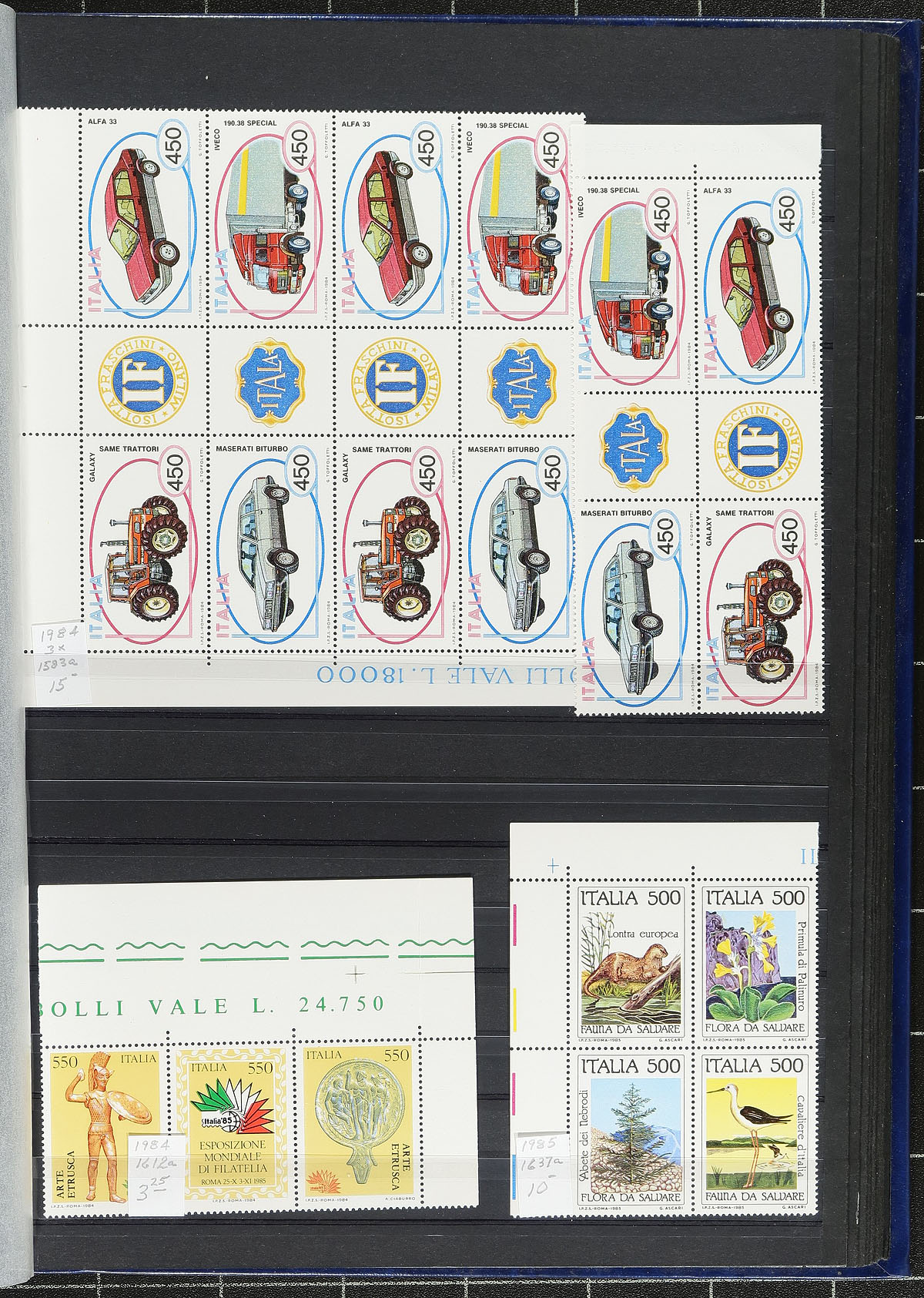Interesting collection of mint and used Italy, 1945-2013, containing over 800 stamps housed in 2 stockbooks. The bulk of the lot comes from the first stockbook containing mostly back of the book material including revenues, parcel posts, special delivery, postage dues and more, noting some sets and partial sets cataloguing $20 and up. The second stockbook contains mint strips, blocks, and souvenir sheets, primarily from 1955 to 2013. Each stamp has been meticulously identified and includes current catalogue prices from the owner. A nice lot for all collectors, with room in both stockbooks for further expansion. 2026 Scott US$810.00 =