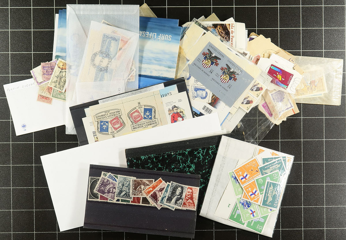 Accumulation of thousands of stamps in a carton, fairly organized in hundreds of glassines, 102 cards, along with material in envelopes, pages, etc. A spot check revealed primarily used stamps, from the Victorian era to the 1970's, with better representation from Great Britain and Commonwealth countries, Europe, and the United States. Some 102 cards have been priced for retail ranging from $1 to $5 per card, with a few items $10 and up. Could hold a few finds for the worldwide collector. Estimate =