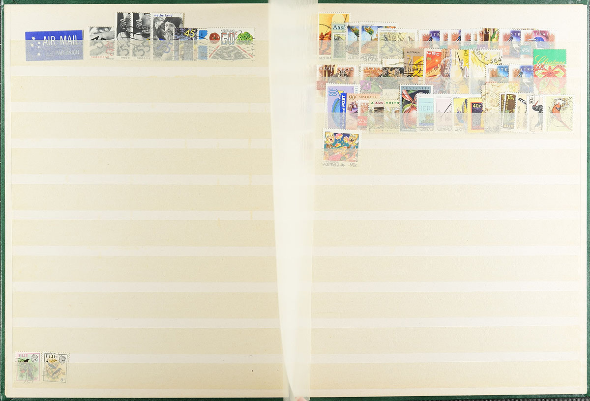 Accumulation of primarily used stamps filling a carton. The lot contains a few thousand stamps, generally on loose album pages, manila stock pages, stockbooks, and more. A spot check indicated material from the 1890's to the 1970's, with material possible on either side of the given range, with better representation from British Commonwealth and Middle East countries. A nice lot for the worldwide collector, containing several possible finds. Estimate =