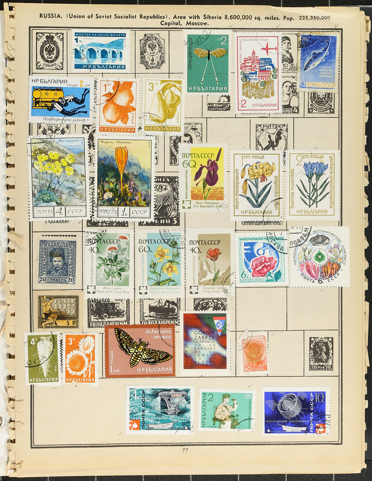 Accumulation of primarily used stamps filling a carton. The lot contains a few thousand stamps, generally on loose album pages, manila stock pages, stockbooks, and more. A spot check indicated material from the 1890's to the 1970's, with material possible on either side of the given range, with better representation from British Commonwealth and Middle East countries. A nice lot for the worldwide collector, containing several possible finds. Estimate =