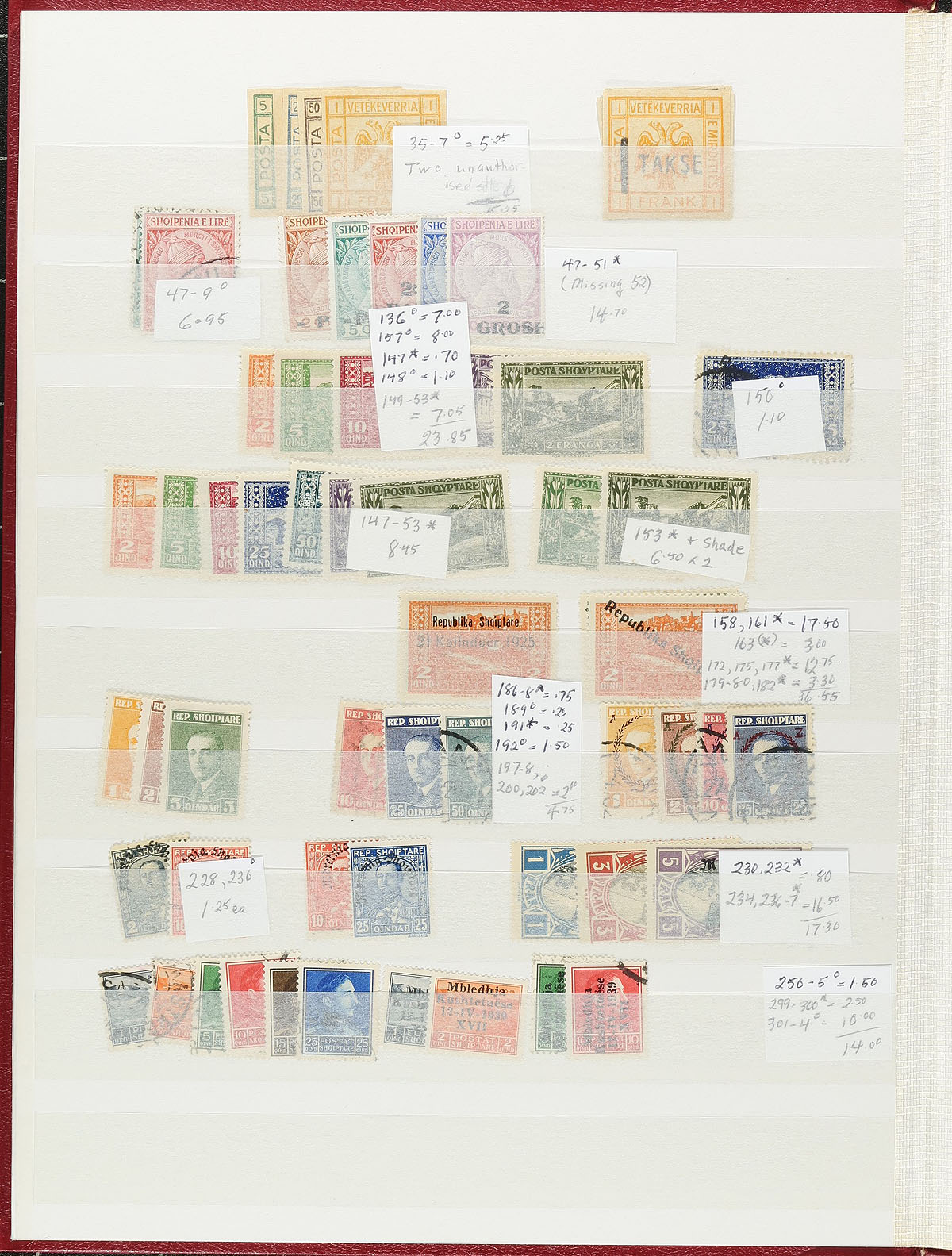 Neatly organized worldwide dealer stock in 6 binders, containing many hundreds of stamps including mint and used singles, sets, partial sets, and souvenir sheets in 6 stockbooks. The lot consists of 3 stockbooks with material ranging from G to M countries, along with a stockbook each of Europe, Latin America, and miscellaneous stamps. Each stockbook includes owner's identification and catalogue pricing, noting the majority of singles and sets ranging from $1 to $5 each, with some sets cataloguing $15 and up. We note better representation from European and British Commonwealth countries. A nice opportunity for collectors (especially thematic and topical), and dealers look for already identified material. Our photos show a sampling. Estimate =