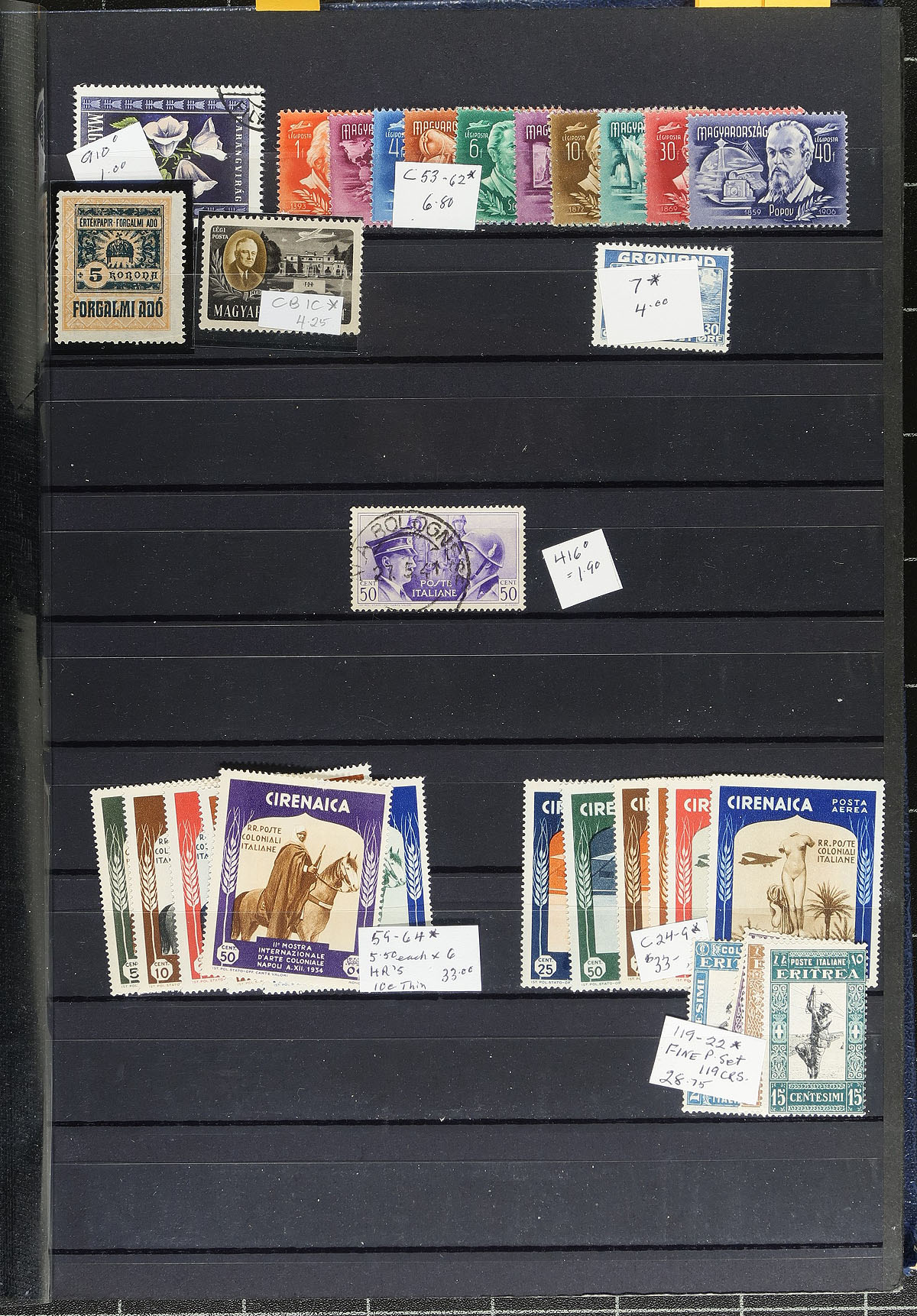 Neatly organized worldwide dealer stock in 6 binders, containing many hundreds of stamps including mint and used singles, sets, partial sets, and souvenir sheets in 6 stockbooks. The lot consists of 3 stockbooks with material ranging from G to M countries, along with a stockbook each of Europe, Latin America, and miscellaneous stamps. Each stockbook includes owner's identification and catalogue pricing, noting the majority of singles and sets ranging from $1 to $5 each, with some sets cataloguing $15 and up. We note better representation from European and British Commonwealth countries. A nice opportunity for collectors (especially thematic and topical), and dealers look for already identified material. Our photos show a sampling. Estimate =