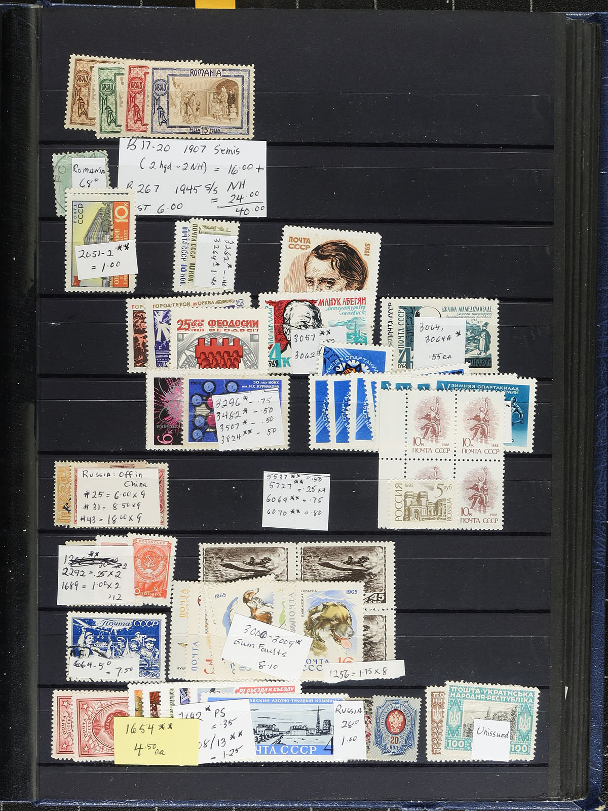 Neatly organized worldwide dealer stock in 6 binders, containing many hundreds of stamps including mint and used singles, sets, partial sets, and souvenir sheets in 6 stockbooks. The lot consists of 3 stockbooks with material ranging from G to M countries, along with a stockbook each of Europe, Latin America, and miscellaneous stamps. Each stockbook includes owner's identification and catalogue pricing, noting the majority of singles and sets ranging from $1 to $5 each, with some sets cataloguing $15 and up. We note better representation from European and British Commonwealth countries. A nice opportunity for collectors (especially thematic and topical), and dealers look for already identified material. Our photos show a sampling. Estimate =