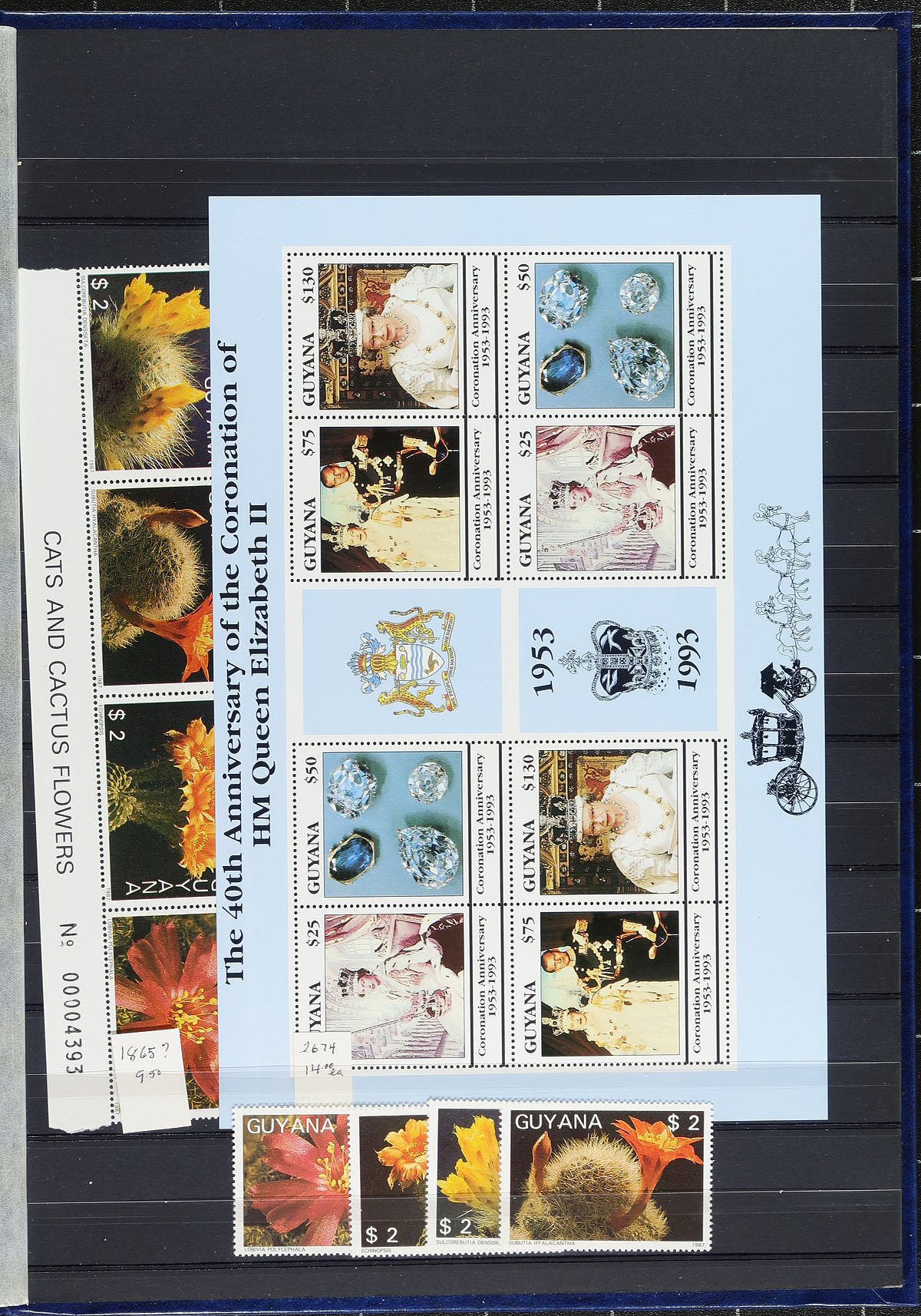 Neatly organized worldwide dealer stock in 6 binders, containing many hundreds of stamps including mint and used singles, sets, partial sets, and souvenir sheets in 6 stockbooks. The lot consists of 3 stockbooks with material ranging from G to M countries, along with a stockbook each of Europe, Latin America, and miscellaneous stamps. Each stockbook includes owner's identification and catalogue pricing, noting the majority of singles and sets ranging from $1 to $5 each, with some sets cataloguing $15 and up. We note better representation from European and British Commonwealth countries. A nice opportunity for collectors (especially thematic and topical), and dealers look for already identified material. Our photos show a sampling. Estimate =