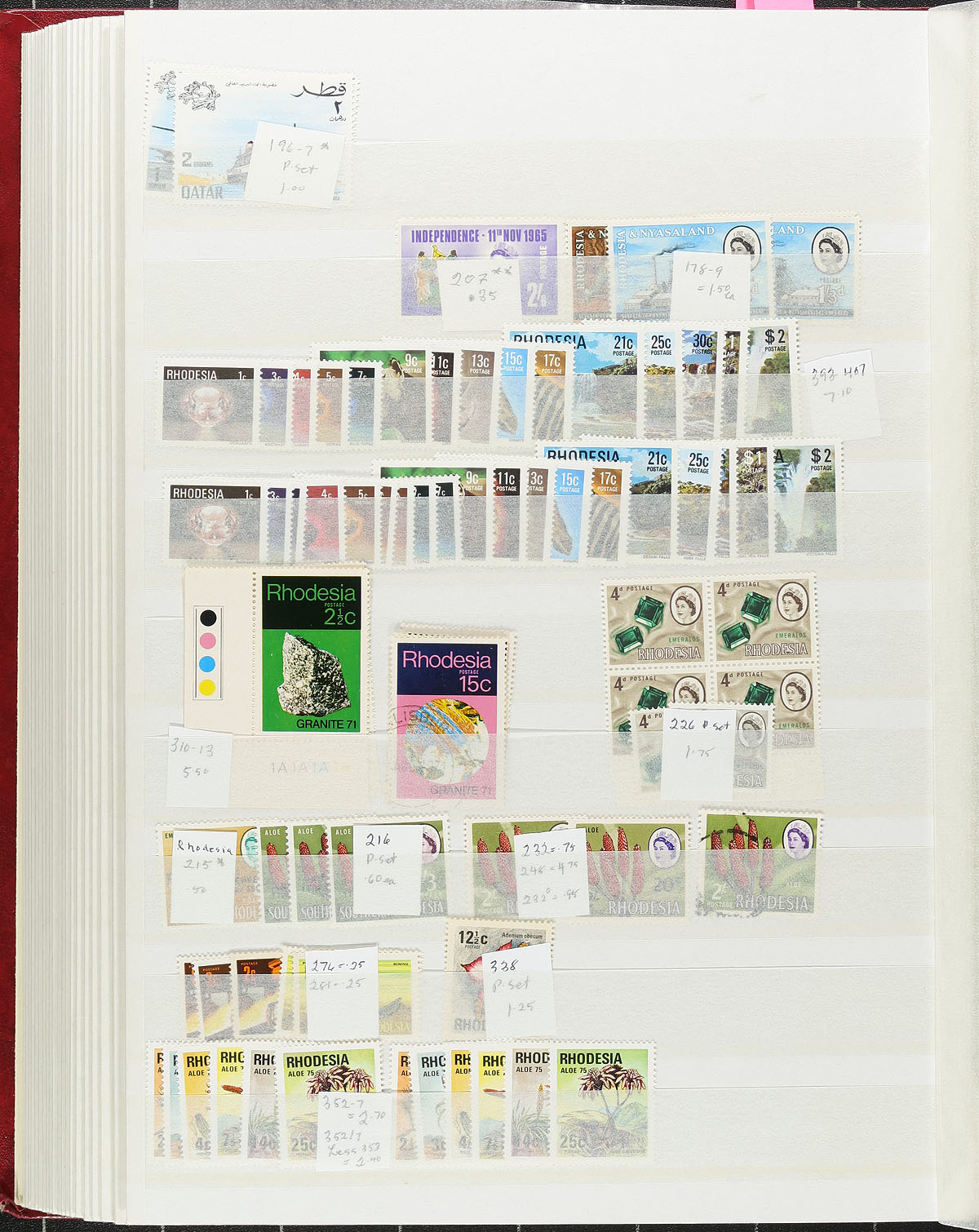 Neatly organized worldwide dealer stock in 6 binders, containing many hundreds of stamps including mint and used singles, sets, partial sets, and souvenir sheets in 6 stockbooks. The lot consists of 3 stockbooks with material ranging from N to Z countries, along with 3 stockbooks containing primarily European countries. Each stockbook includes owner's identification and catalogue pricing, noting the majority of singles and sets ranging from $1 to $5 each, with some sets cataloguing $15 and up. We note better representation from European and British Commonwealth countries. A nice opportunity for collectors (especially thematic and topical), and dealers look for already identified material. Our photos show a sampling. Estimate =