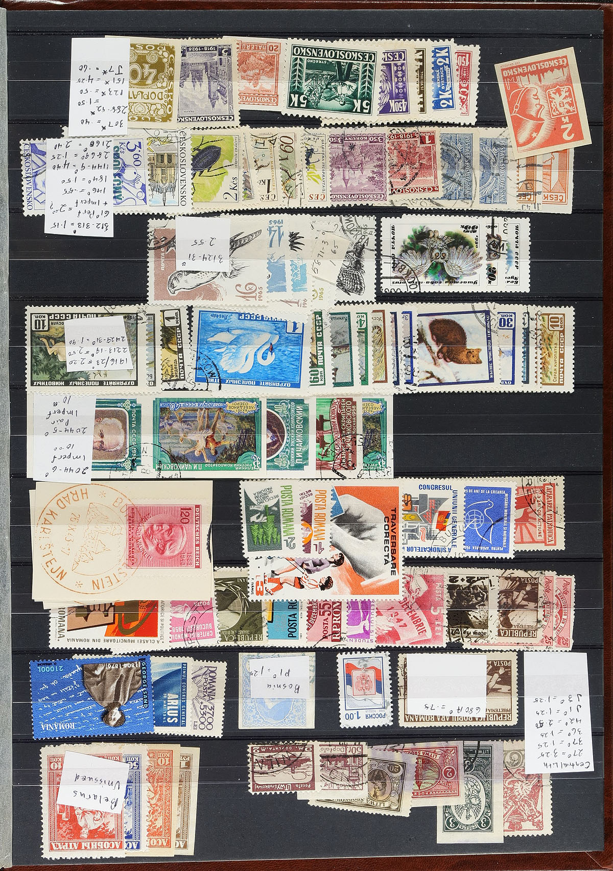 Neatly organized worldwide dealer stock in 6 binders, containing many hundreds of stamps including mint and used singles, sets, partial sets, and souvenir sheets in 6 stockbooks. The lot consists of 3 stockbooks with material ranging from N to Z countries, along with 3 stockbooks containing primarily European countries. Each stockbook includes owner's identification and catalogue pricing, noting the majority of singles and sets ranging from $1 to $5 each, with some sets cataloguing $15 and up. We note better representation from European and British Commonwealth countries. A nice opportunity for collectors (especially thematic and topical), and dealers look for already identified material. Our photos show a sampling. Estimate =