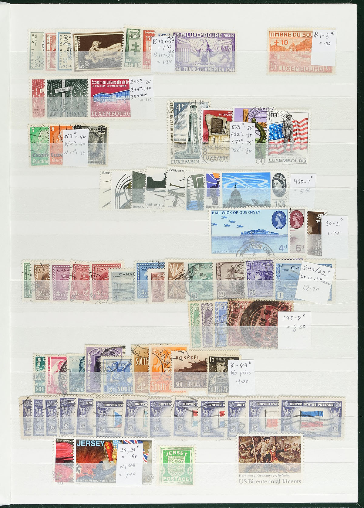 Neatly organized worldwide dealer stock in 6 binders, containing many hundreds of stamps including mint and used singles, sets, partial sets, and souvenir sheets in 6 stockbooks. The lot consists of 3 stockbooks with material ranging from N to Z countries, along with 3 stockbooks containing primarily European countries. Each stockbook includes owner's identification and catalogue pricing, noting the majority of singles and sets ranging from $1 to $5 each, with some sets cataloguing $15 and up. We note better representation from European and British Commonwealth countries. A nice opportunity for collectors (especially thematic and topical), and dealers look for already identified material. Our photos show a sampling. Estimate =