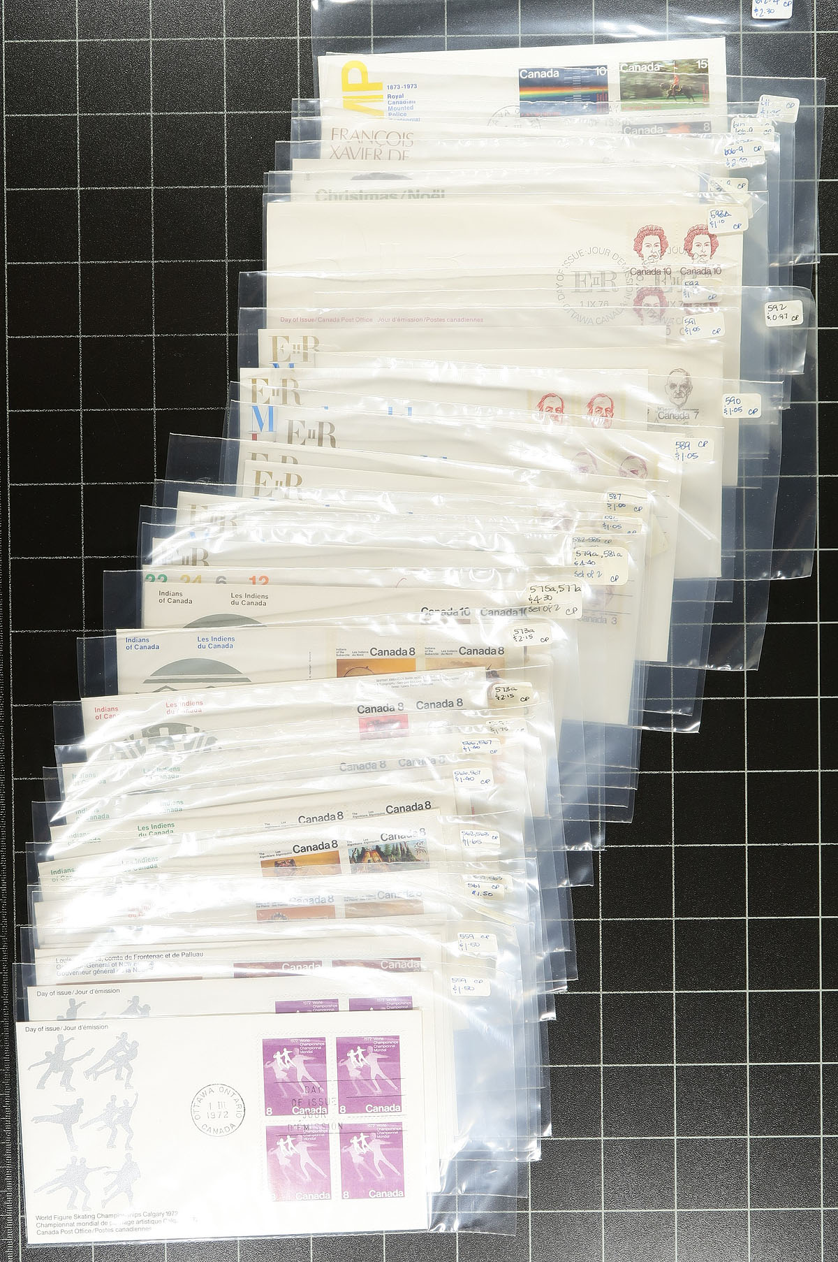 First Day Covers. A group of a few hundred Canada first day covers, 1961-1982, filling a small box, with singles, sets, blocks, plate blocks and high denomination frankings. Each cover is sleeved with older retail pricing attached, generally $1to $3 each, with a few priced higher, and includes roughly 70 private cachet covers, noting makers Elliot-Marion and Schering, among a few others. Roughly 30 covers are #10 sized envelopes. A nice grouping for the first day cover collector. Estimate =