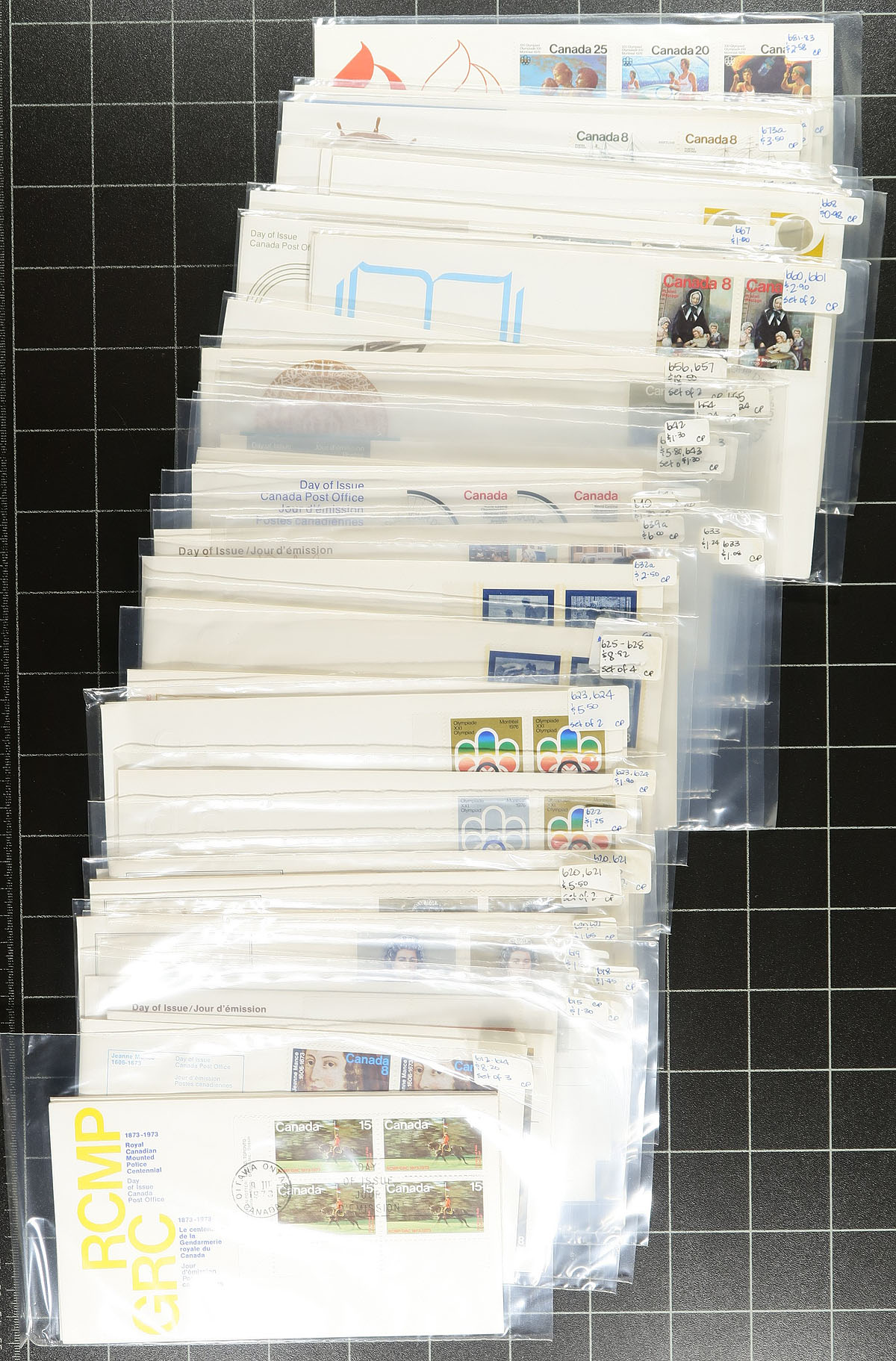 First Day Covers. A group of a few hundred Canada first day covers, 1961-1982, filling a small box, with singles, sets, blocks, plate blocks and high denomination frankings. Each cover is sleeved with older retail pricing attached, generally $1to $3 each, with a few priced higher, and includes roughly 70 private cachet covers, noting makers Elliot-Marion and Schering, among a few others. Roughly 30 covers are #10 sized envelopes. A nice grouping for the first day cover collector. Estimate =