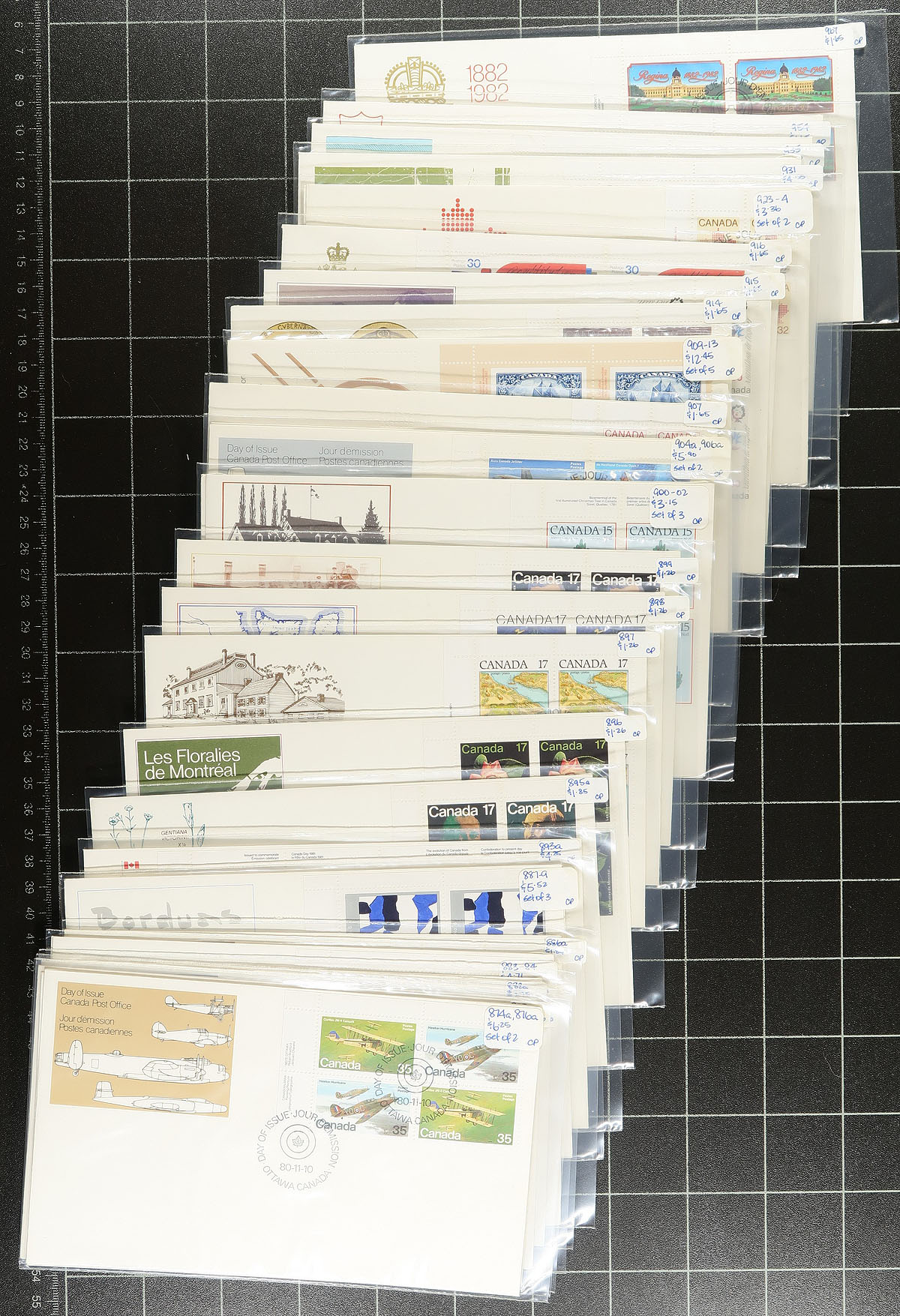 First Day Covers. A group of a few hundred Canada first day covers, 1961-1982, filling a small box, with singles, sets, blocks, plate blocks and high denomination frankings. Each cover is sleeved with older retail pricing attached, generally $1to $3 each, with a few priced higher, and includes roughly 70 private cachet covers, noting makers Elliot-Marion and Schering, among a few others. Roughly 30 covers are #10 sized envelopes. A nice grouping for the first day cover collector. Estimate =