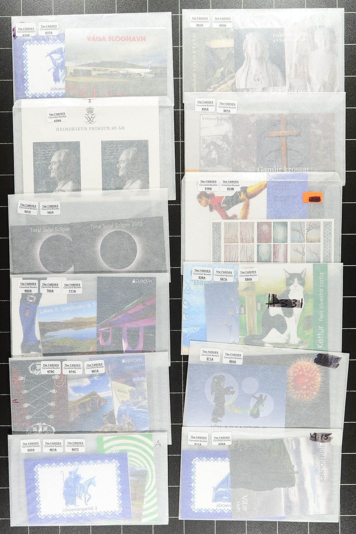 Group of 123 Faroe Islands booklets, all in well described glassines (generally 2 to 3 per glassine), ranging from 138A/716A. The lot essentially is in two halves with 62 different booklets being mint, and the other set of booklets having a variety of pictorial cancellations from Torshavn. A lovely clean group from this popular collecting region. Estimate =