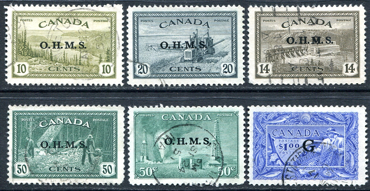 A choice selection of six different, all-used "O.H.M.S." and "G" overprinted Official stamps, including four values from the George VI "Peace" (including the key-value 50c Lumbering), 1950 issued 50c Oil Wells and 1951 issued $1.00 Fisheries. These can be hard to find nicely used. 2024 Scott US$188.35 =