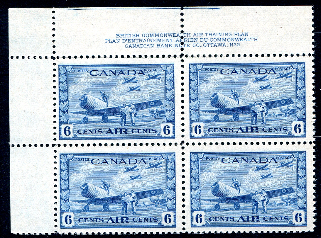 VF mint Never Hinged upper left position plate #2 plate block of the 6c blue "Harvard Trainer - Commonwealth Air Training Plan" War Issue Airmail. A very rare / key-value George VI era plate block. 2024 Unitrade =