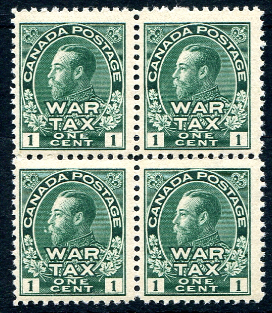 Fresh and F/VF mint Never Hinged block of four of the 1c green 1915 issue George V Admiral War Tax issue. Great colour and umblemished gum. 2024 Scott US$330.00 =