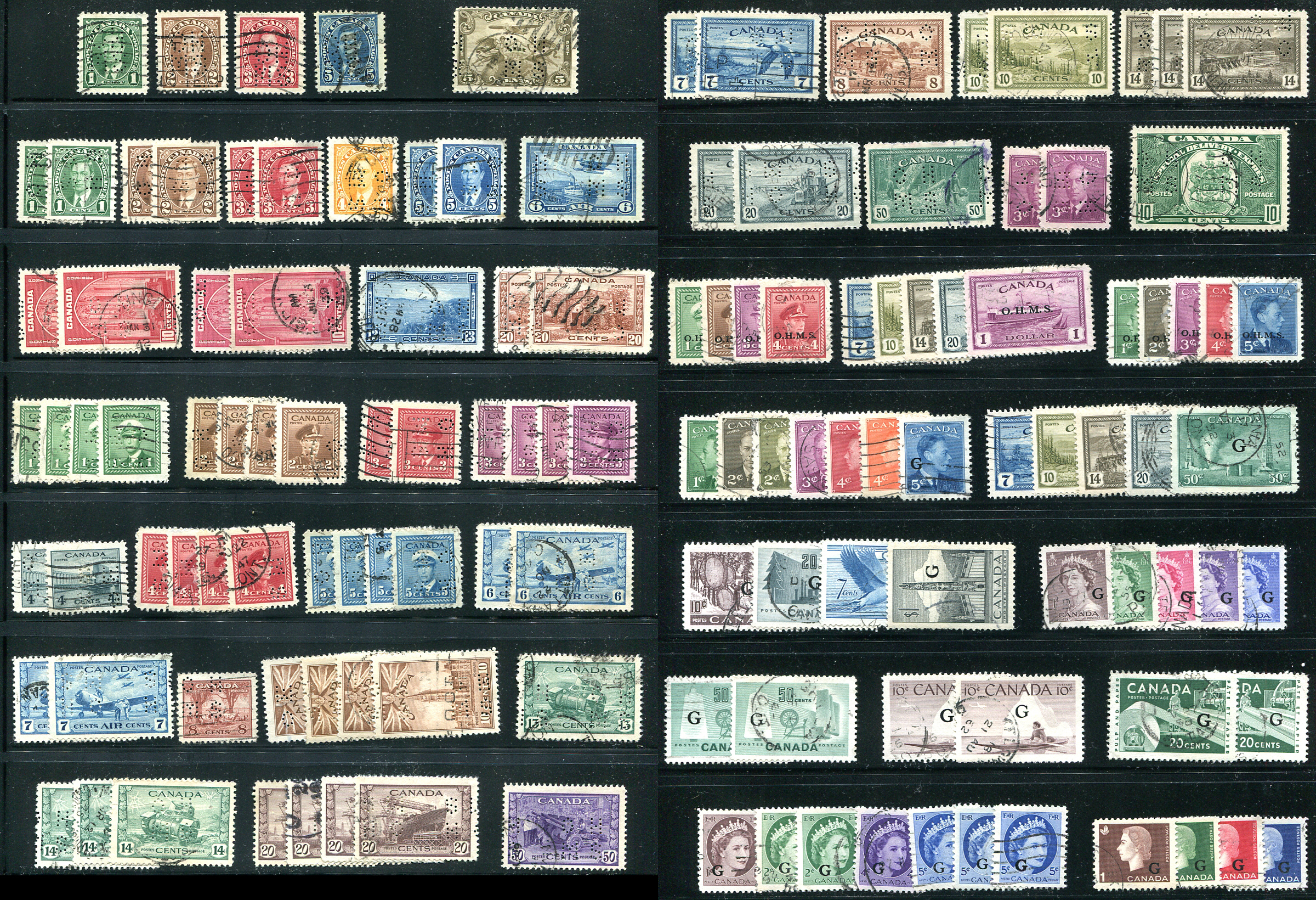 Double-sided stocksheet with Officials including 4 and 5 hole OHMS perfins and OHMS and G overprints. All are used and all 130 stamps are different as to perf position and perf type. Valued by the owner using a very old 2010 Unitrade / Wrigley catalogue, which comes out to $280.00. Most (if not all) of these prices have increased since then! Perfect for dated postmarks and perfin positions! Estimate =
