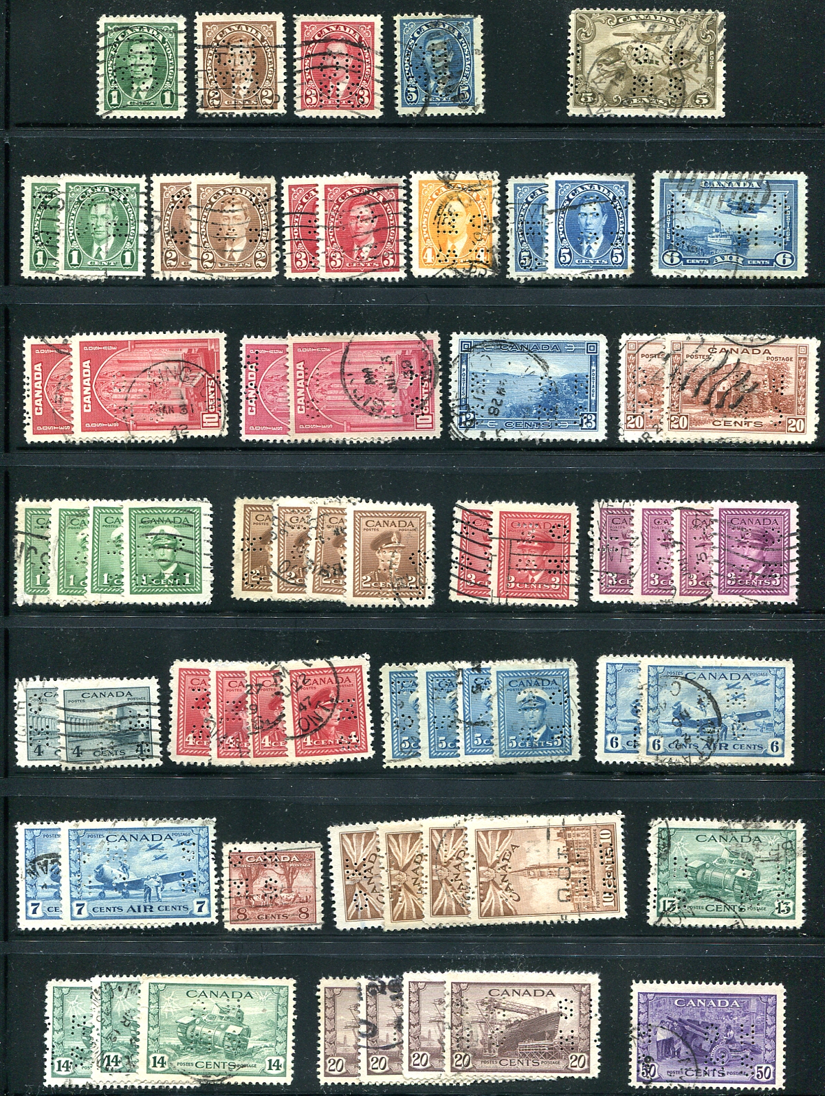 Double-sided stocksheet with Officials including 4 and 5 hole OHMS perfins and OHMS and G overprints. All are used and all 130 stamps are different as to perf position and perf type. Valued by the owner using a very old 2010 Unitrade / Wrigley catalogue, which comes out to $280.00. Most (if not all) of these prices have increased since then! Perfect for dated postmarks and perfin positions! Estimate =