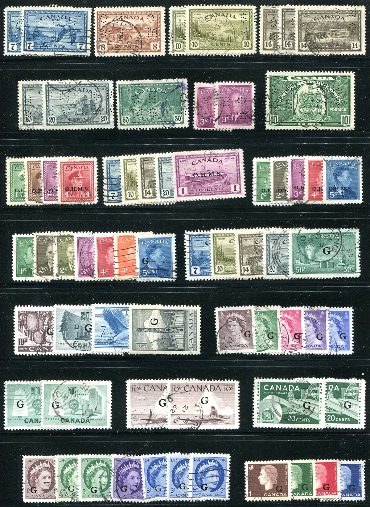 Double-sided stocksheet with Officials including 4 and 5 hole OHMS perfins and OHMS and G overprints. All are used and all 130 stamps are different as to perf position and perf type. Valued by the owner using a very old 2010 Unitrade / Wrigley catalogue, which comes out to $280.00. Most (if not all) of these prices have increased since then! Perfect for dated postmarks and perfin positions! Estimate =