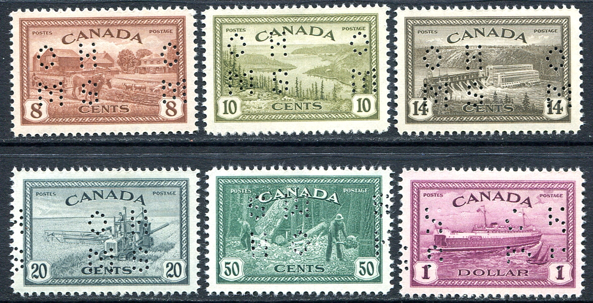 VF mint Hinged complete set of the 1946 Peace issue (6 values), all with 4-hole "O.H.M.S." official perfins. A great little set. Listed in Unitrade as O10-268 to O10-273. 2024 Scott US$195.75 =