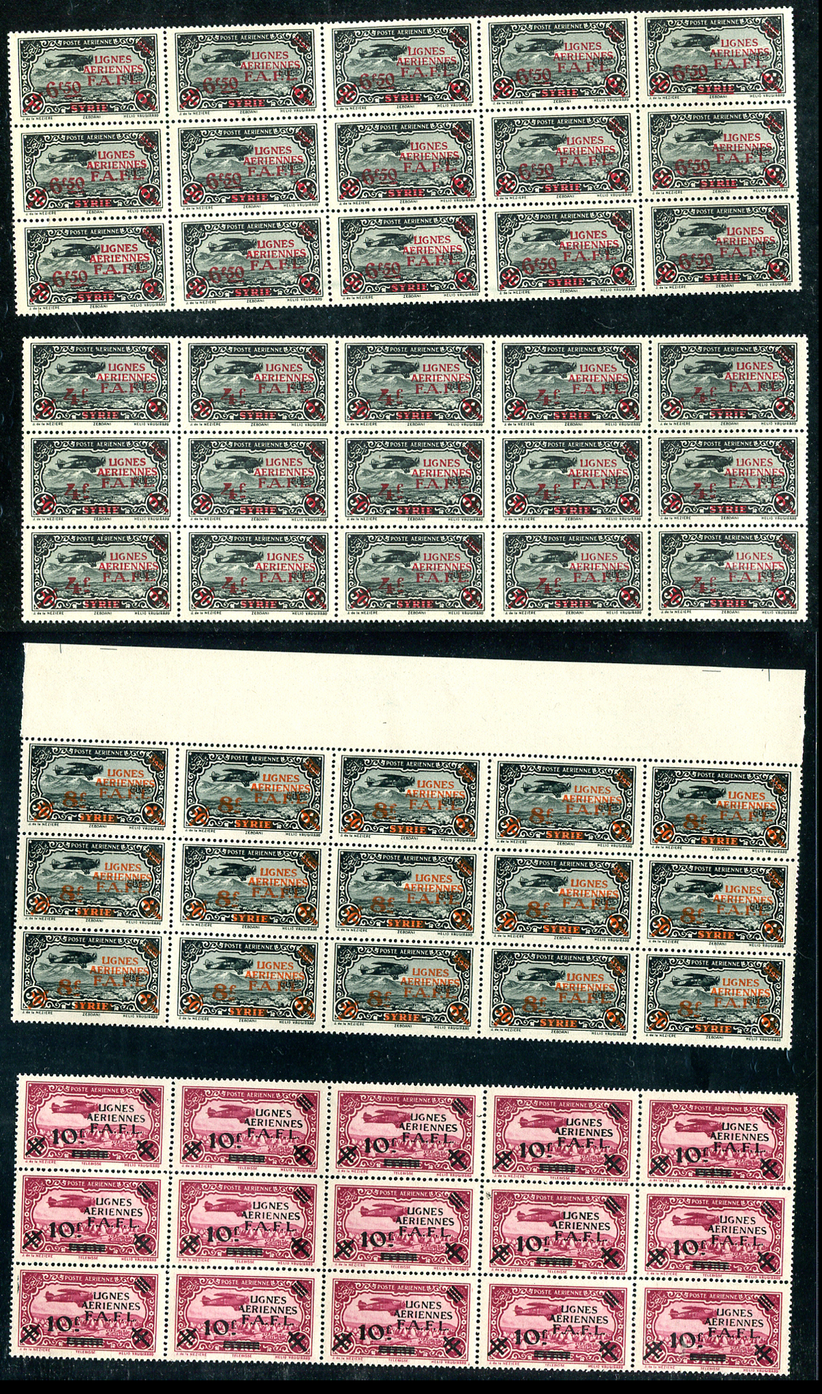 Complete set of the 1942 Free French Administration overprints on 1931 Airmail issue, in complete mint, never hinged, blocks of 15, the MC3 with the top pane selvedge. Break up or keep as the showpieces that they are. 2024 Scott US$540.00 =