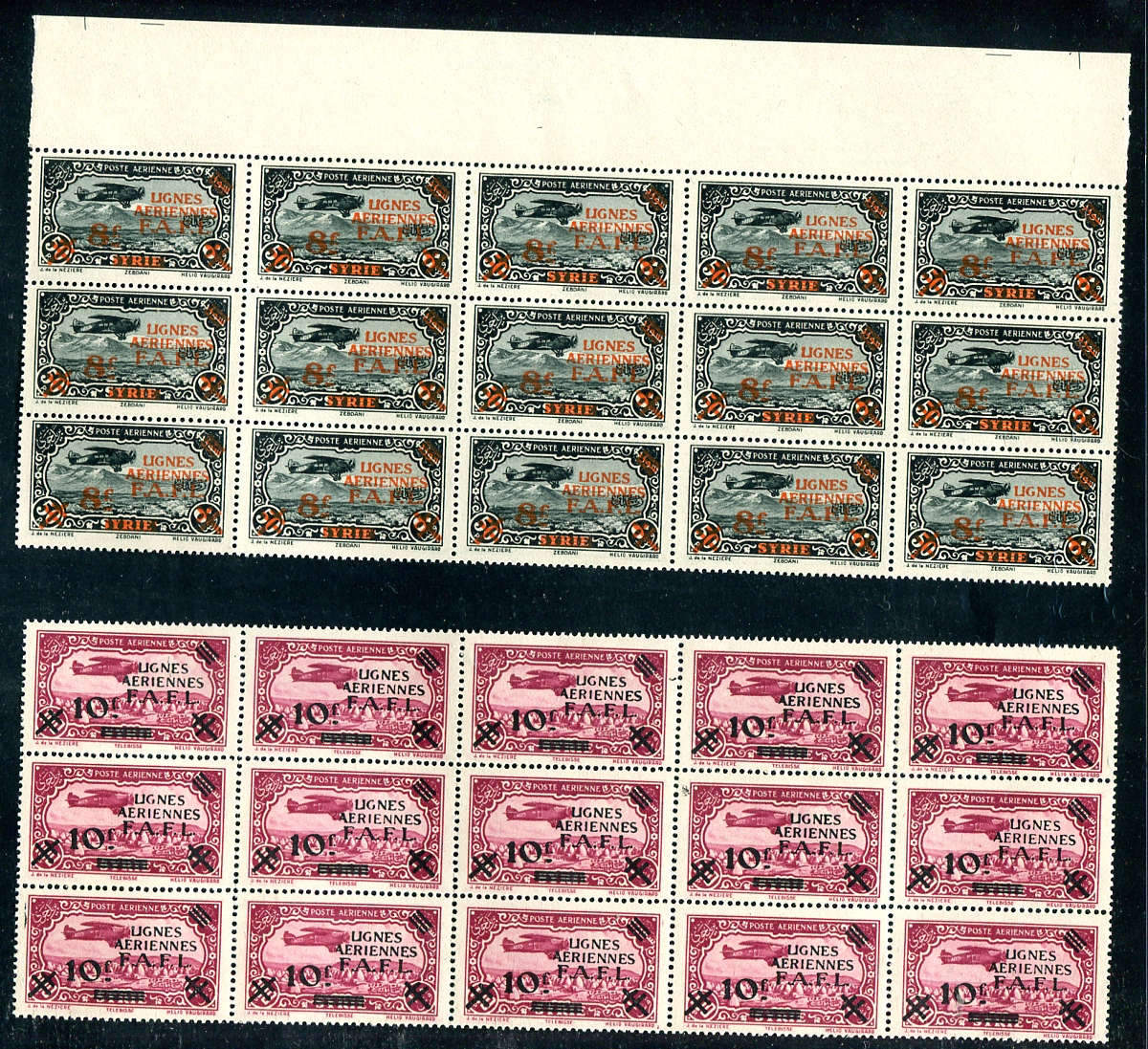 Complete set of the 1942 Free French Administration overprints on 1931 Airmail issue, in complete mint, never hinged, blocks of 15, the MC3 with the top pane selvedge. Break up or keep as the showpieces that they are. 2024 Scott US$540.00 =