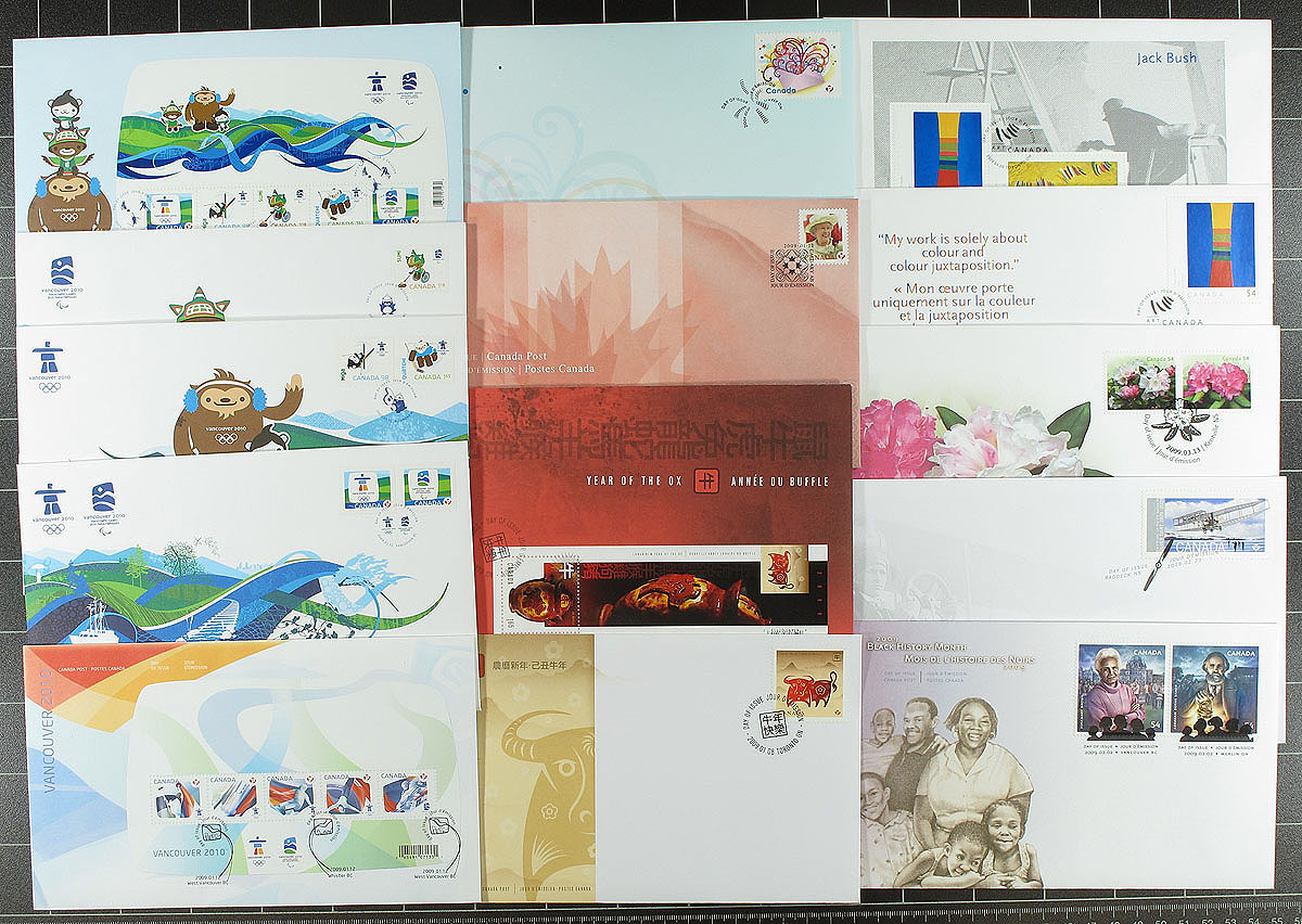 First Day Covers 2005-2010. Collection of 183 First Day Covers from 2005 to 2010 (of the 193 issued) in 6 Canada Post real wood boxes, including singles, souvenir sheets and joint issue covers. All of the collections appear to be incomplete, with the 2005 box containing 32 FDCs (issued with 38), 2006 with 36 (issued with 32), 2007 with 28 (issued with 29), 2008 with 27 (issued with 32), 2009 with 29 (issued with 30), and 2010 with 31 (issued with 32). These collections have proven popular and hard to find, and could be quickly completed with a little searching. The original issue price of the 6 boxes was $452.53. Estimate =