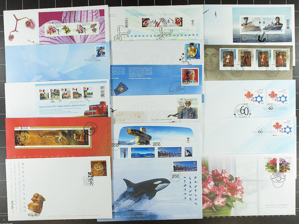 First Day Covers 2005-2010. Collection of 183 First Day Covers from 2005 to 2010 (of the 193 issued) in 6 Canada Post real wood boxes, including singles, souvenir sheets and joint issue covers. All of the collections appear to be incomplete, with the 2005 box containing 32 FDCs (issued with 38), 2006 with 36 (issued with 32), 2007 with 28 (issued with 29), 2008 with 27 (issued with 32), 2009 with 29 (issued with 30), and 2010 with 31 (issued with 32). These collections have proven popular and hard to find, and could be quickly completed with a little searching. The original issue price of the 6 boxes was $452.53. Estimate =