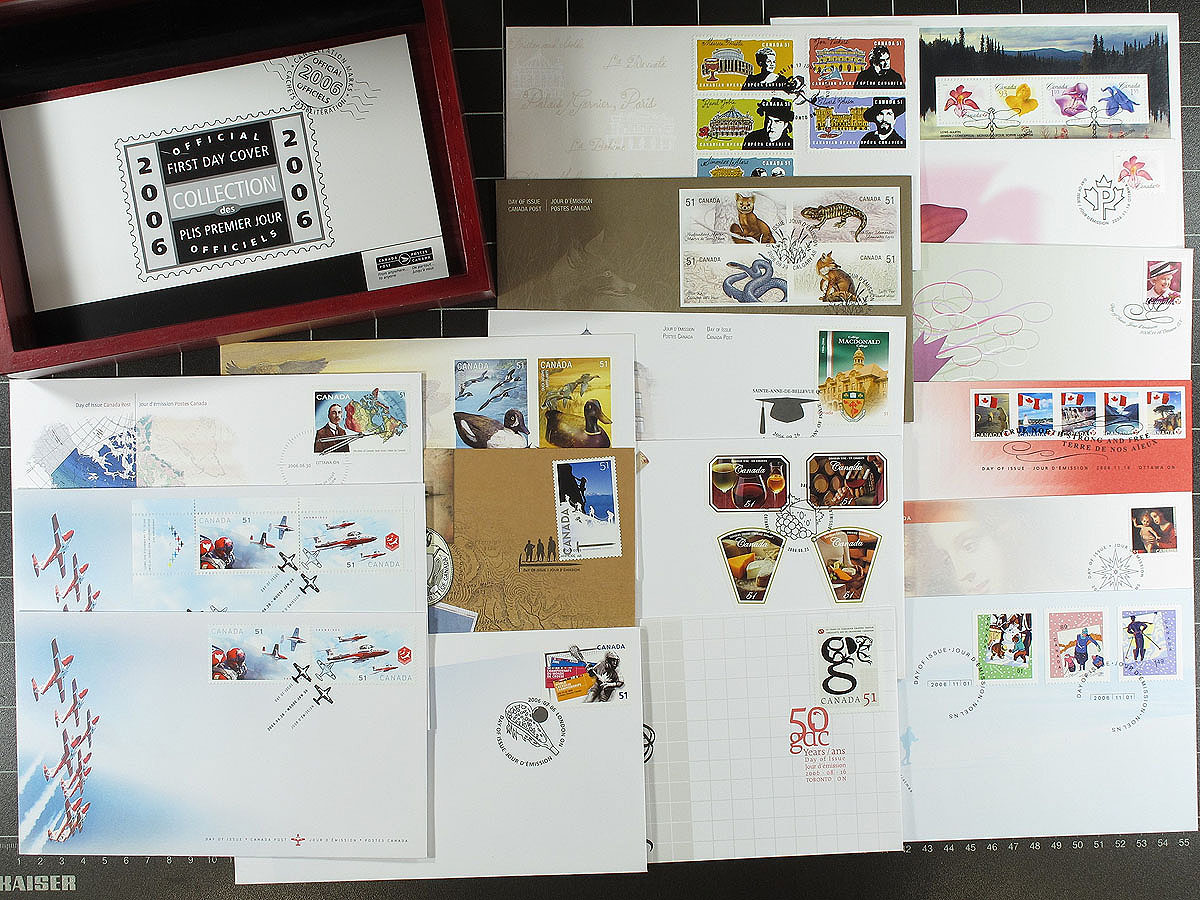 First Day Covers 2005-2010. Collection of 183 First Day Covers from 2005 to 2010 (of the 193 issued) in 6 Canada Post real wood boxes, including singles, souvenir sheets and joint issue covers. All of the collections appear to be incomplete, with the 2005 box containing 32 FDCs (issued with 38), 2006 with 36 (issued with 32), 2007 with 28 (issued with 29), 2008 with 27 (issued with 32), 2009 with 29 (issued with 30), and 2010 with 31 (issued with 32). These collections have proven popular and hard to find, and could be quickly completed with a little searching. The original issue price of the 6 boxes was $452.53. Estimate =