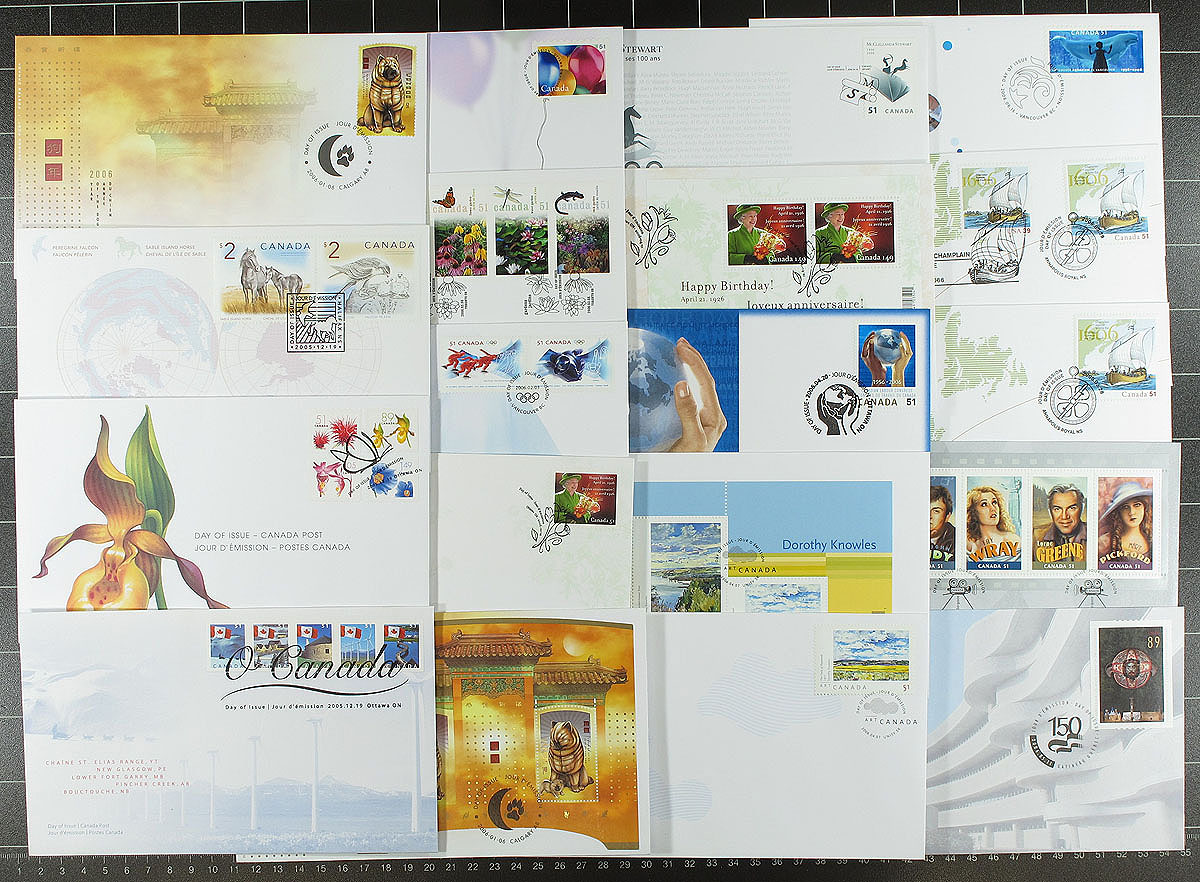 First Day Covers 2005-2010. Collection of 183 First Day Covers from 2005 to 2010 (of the 193 issued) in 6 Canada Post real wood boxes, including singles, souvenir sheets and joint issue covers. All of the collections appear to be incomplete, with the 2005 box containing 32 FDCs (issued with 38), 2006 with 36 (issued with 32), 2007 with 28 (issued with 29), 2008 with 27 (issued with 32), 2009 with 29 (issued with 30), and 2010 with 31 (issued with 32). These collections have proven popular and hard to find, and could be quickly completed with a little searching. The original issue price of the 6 boxes was $452.53. Estimate =