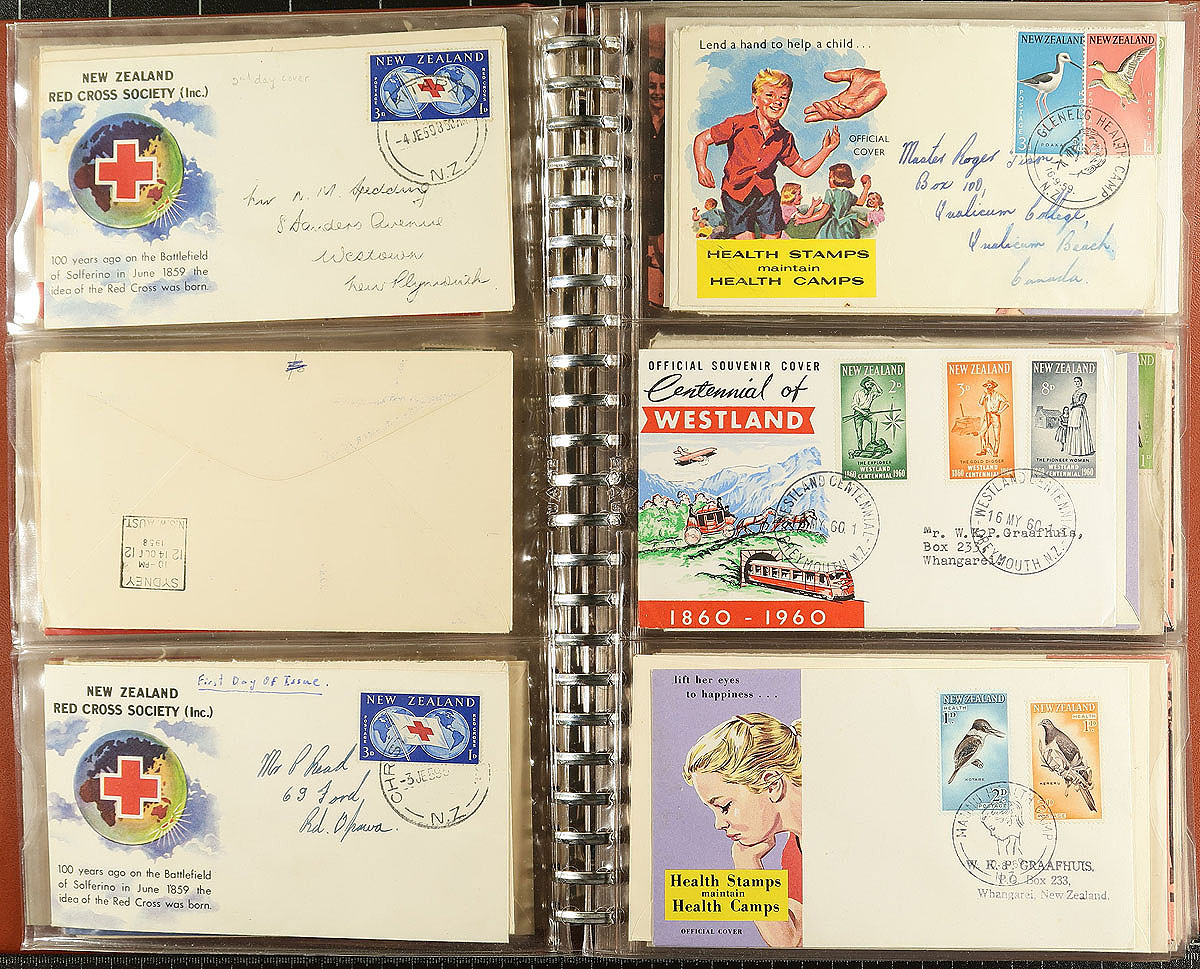 Nice collection of 186 first day covers, 1938-1979, mostly with privately added cachets and the majority are addressed. Includes a number of health issues with a number of "Camp" cancels. These private cachets are increasingly being documented and catalogued, some of which are surprisingly desirable. A very clean, lightly duplicated, group which are hosted in a pair of first day cover albums. Estimate =