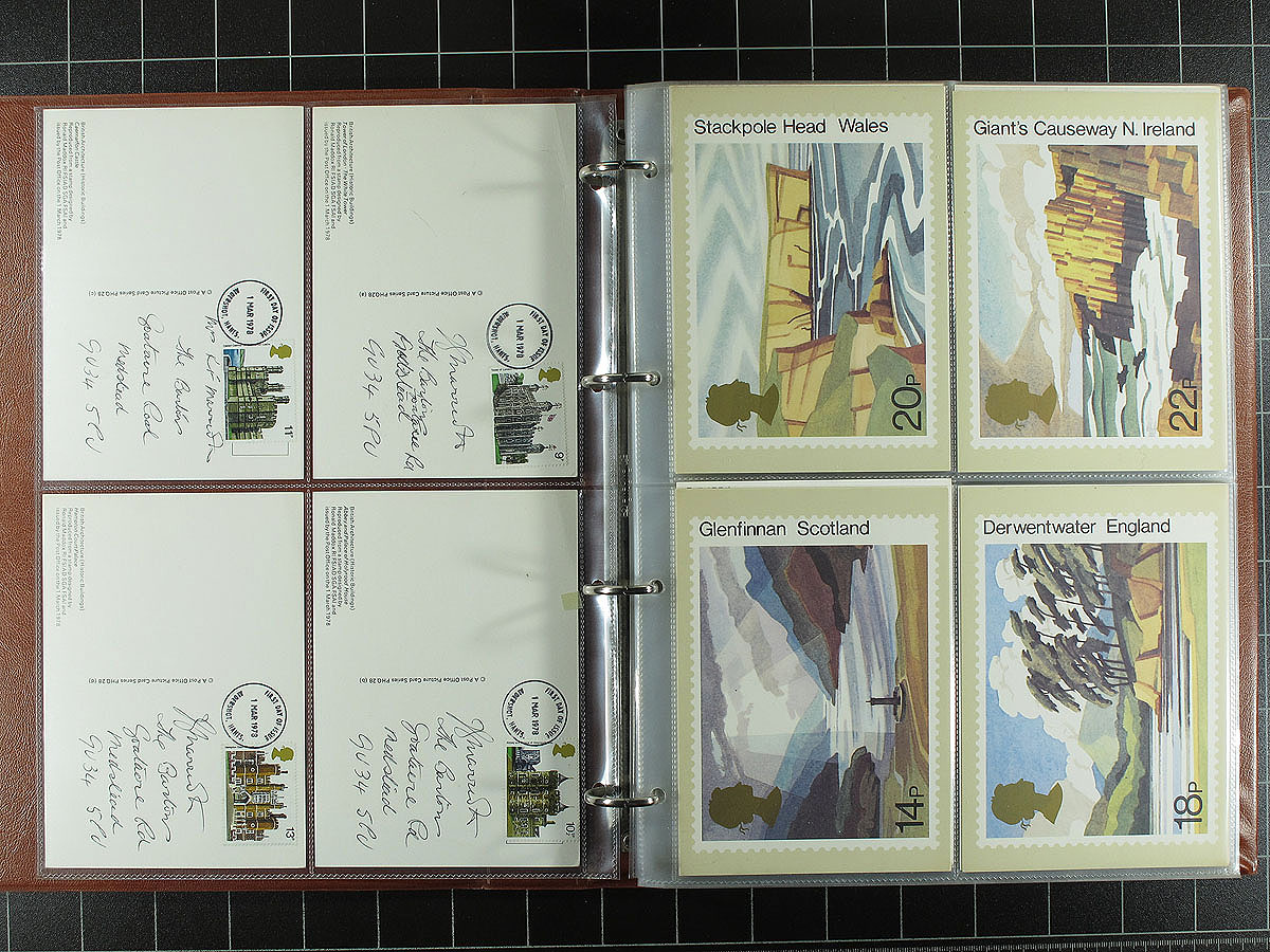 First Day Cover / PHQ Card collection 1966-2008. An attractive Elizabethan group of 310 First Day Covers and 388 PHQ neatly arranged in 8 Post Office deluxe padded FDC / Postcard albums. A nice mix of issues, including some better early FDC with privately produced cachets and progressing to the many of the colourful sets / souvenir sheets issued in the 21st century. The PHQ cards (issued by the post office, depicting the upcoming stamp issue) are a much more complete and more modern selection than we usually see. Get your specialized catalogue ready, as the combined value of this lot will start to soar as you add it up. Estimate =